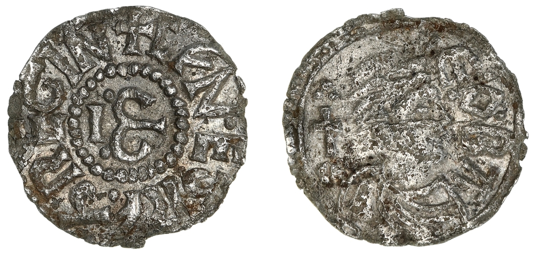 Mercia, Cynethryth (wife of Offa) (757-796), 'Light Coinage', Penny. 757-796. Canterbury mint, Eoba, EOBA before Imperial [Faustina Senior (?)] female bust right, crucifix behind, pellets and trefoils in fields, beaded border, rev. •+• CFN•EÐRF•Ð • REGIN, around barred Mercian M in pelleted circle, 1.08g [15.43grns], 6h (SCBI 67 [BM], 654-8 (all monograms placed at 12h); North 339; S.909), flan slightly warped and edge chipped, seemingly unique variety with Mercian monogram at 9 o'clock, good fine