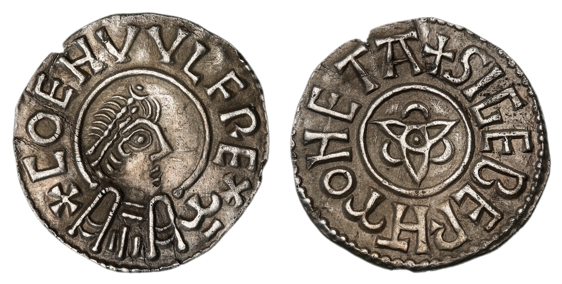 Mercia, Coenwulf (796-821), Group II, 'Triple Aura' Type, Penny, c. 805-810, Canterbury, Sigebeorht, + COENVVLF REX M, diademed and draped bust right, breaking plain inner circle, rev. SIGBERHT MONETA, HT ligate, pellet in annulet on triangle over trefoil, 1.38g [21.20grns], 3h, (EMC 2025.0259 this coin; Naismith C27.2; BMA 78; North 349; S.915), a field find, with resulting light metal stressing resulting from previously bent surfaces, a small chip to edge otherwise pleasingly struck, very fine, an excessively rare type