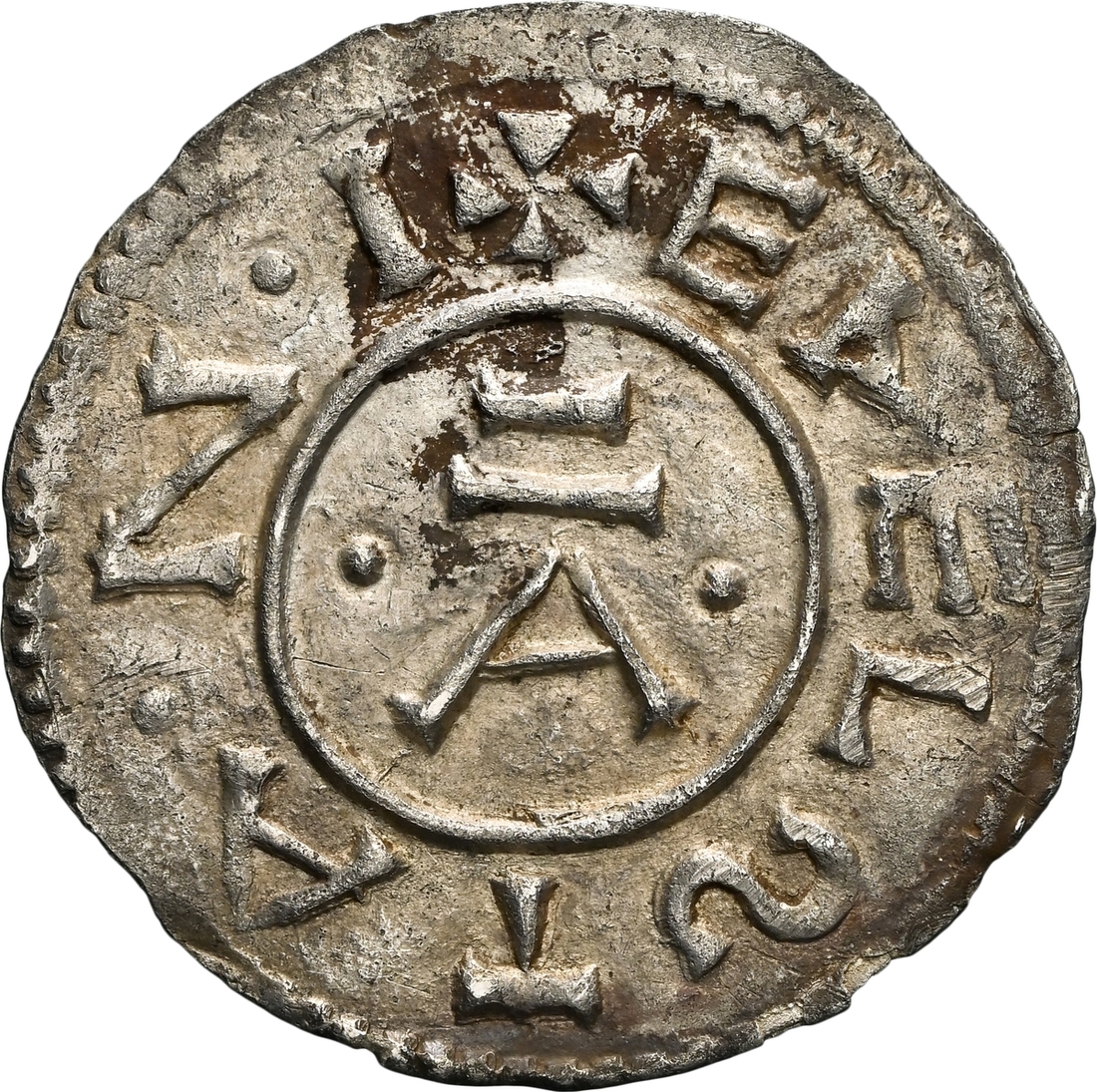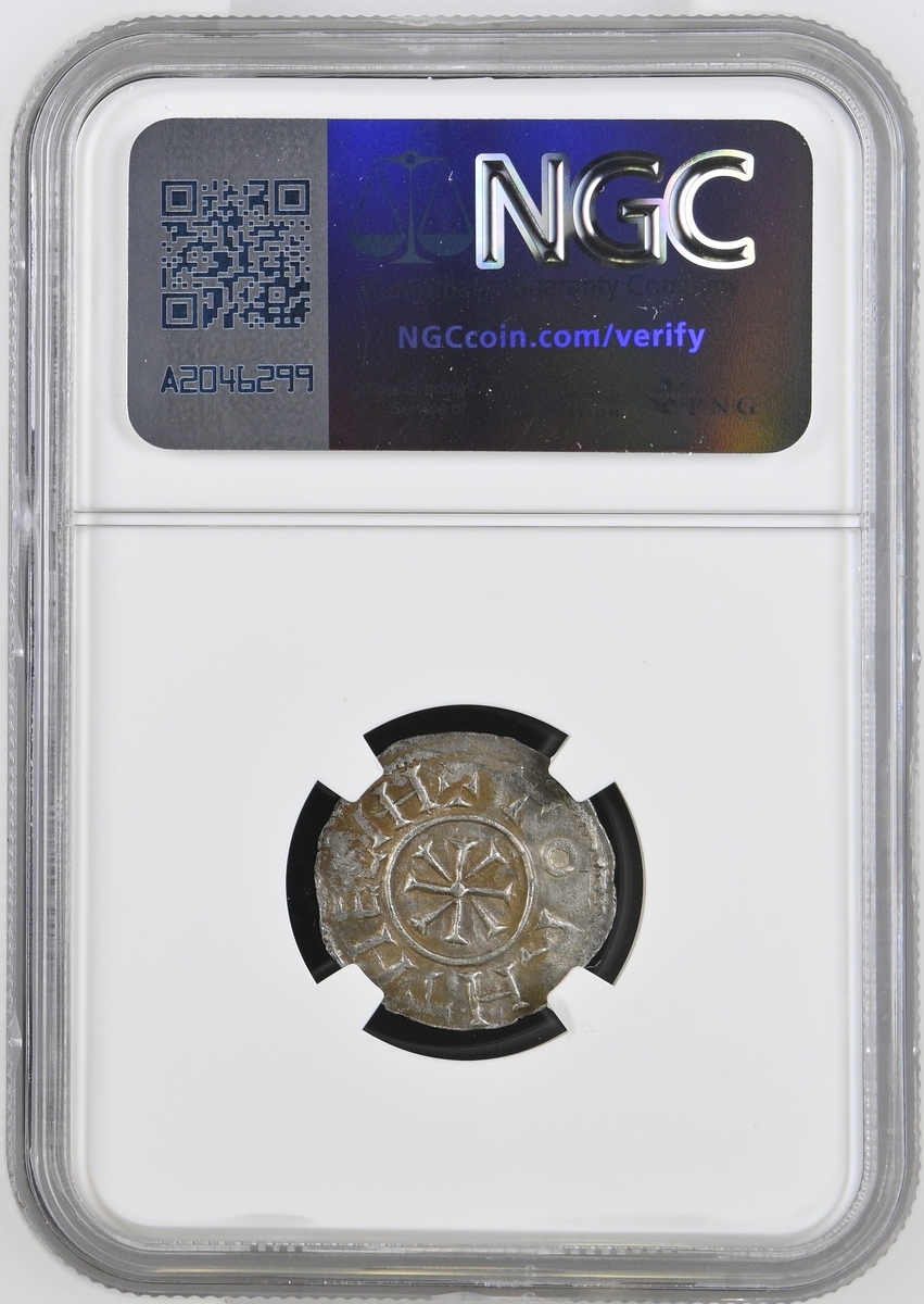 NGC UNC | East Anglia, Æthelstan I (c.825-845) Penny, 'Non-Portrait' Type, Ipswich[?], Torhthelm, + EDELSTA • N • I, around Alpha, flanked by two pellets all contained within linear circle, rev. + TORHTHELM, with stylised M, around cross pattée, with wedges in angles within linear circle, 1.38g [21.30grns], 12h (cf. SCBI 67 [BM], 850, 859, 872; cf. EMC 1982.0004, 2018.0089, 2021.0335 this coin, 2025.0025; Naismith E40.2 variant with inner circle on obverse; North 441; S.950), fully centred bold strike on good metal, lightly toned, about extremely fine for issue, a new variant, excessively rare thus, in NGC holder, graded Uncirculated (Cert. #8222346-001)