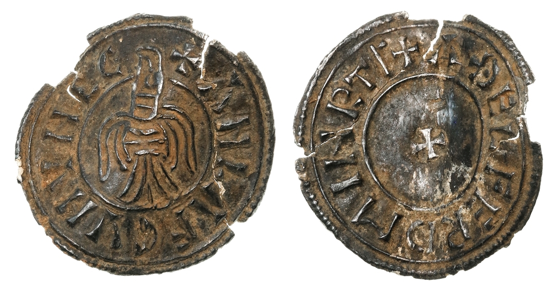 Danelaw, Hiberno-Norse Kings of Northumbria and Dublin, Ánláf Guthfrithsson (939-941), 'Raven' Type, Penny, Jórvík [York], Æthelferth, + ANLAF CVNVN[C, Raven upwards, head left, wings outstretched, rev + AÐELFERD MINRTI, small cross pattée, 1.26g [19.56grns], 12h (Williams II, 238; EMC 2023.0306 this coin; SCBI 65 [Norwegian], 59 [same obverse die]; BMC 1092-96; North 537; S.1019), a field find, bent and hairlines cracks to somewhat ragged edges, nonetheless most pleasingly struck to raven and legends fully legible, about very fine and rare, an ever sought after Viking issue