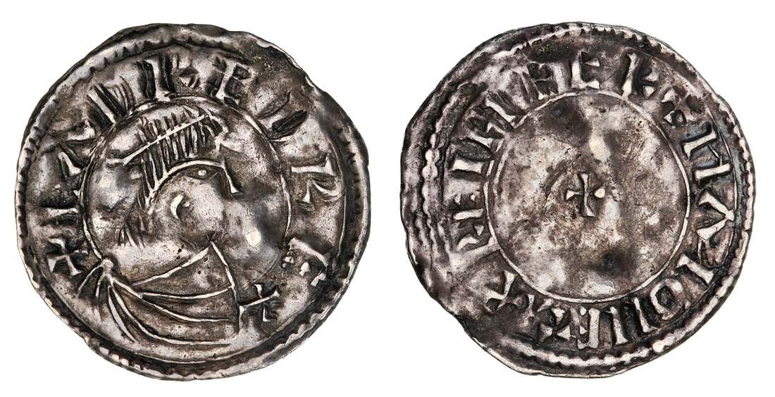 Eadred (946-955), Penny, Crowned Bust Type, Reinferth, + EADRED REX, legend begins at 7 o'clock, crowned and draped bust right, breaking solid inner circle, rev. REINFERTH MONETA around small cross pattée in solid inner circle, 1.52g [23.46grns], 11h (SCBI -; EMC -; North 713; S.1115), flan slightly crinkled but good metal, near very fine