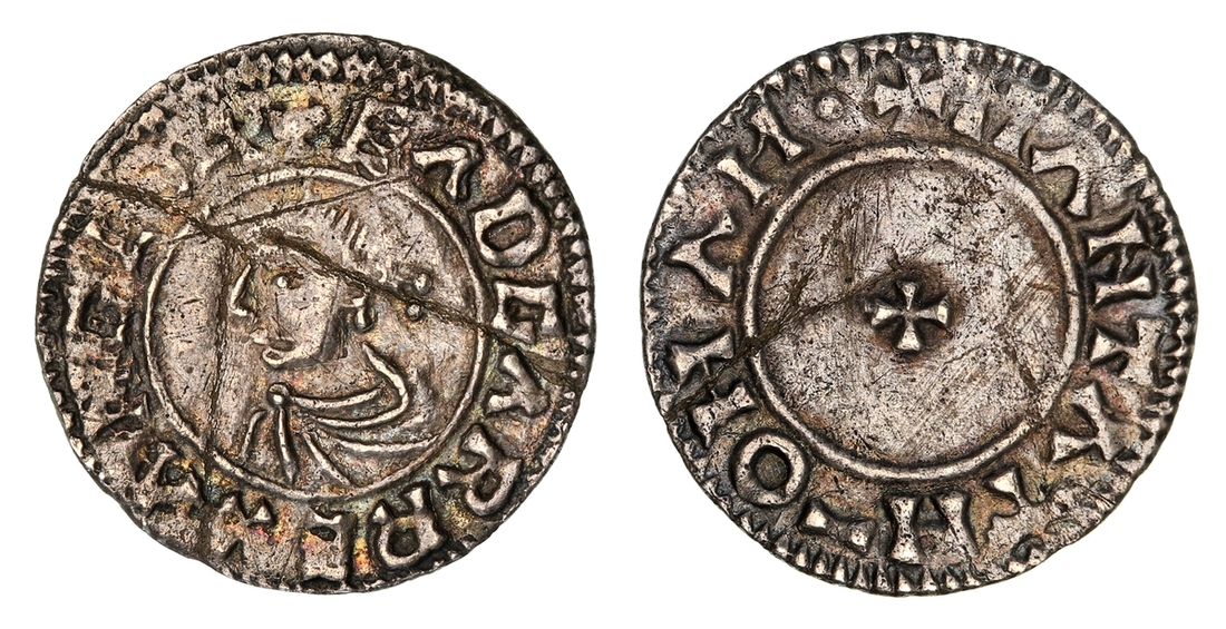Eadgar (959-975), Penny, Reform Type, Northampton, Mantat, + EADGAR REX ANGLOX, diademed and draped bust left, rev. + MANTAT M-O HAM, small cross pattée, 1.29g [19.91grns], 12h (SCBI 4 [Copenhagen], 771; Hildebrand 15; BMC VI; North 752; S.1141), previously creased, scuffed, otherwise toned, fine and rare
