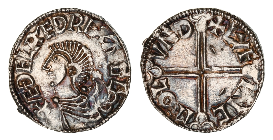 Æthelræd II 'Unræd' (978-1016), 'Long Cross' Type, Penny, 997-1003, London, Leofing, + ÆÐELRÆD REX ANGLO, bare head and draped bust left, rev. + LYFINC MO LYND, voided long cross, 1.69g [26.08grns], 6h (SCBI 7 [Copenhagen], 906; North 774; BMC IVa; S.1151), peck marks to reverse, toned in parts to otherwise bright-silver surfaces, pleasing strike, good very fine