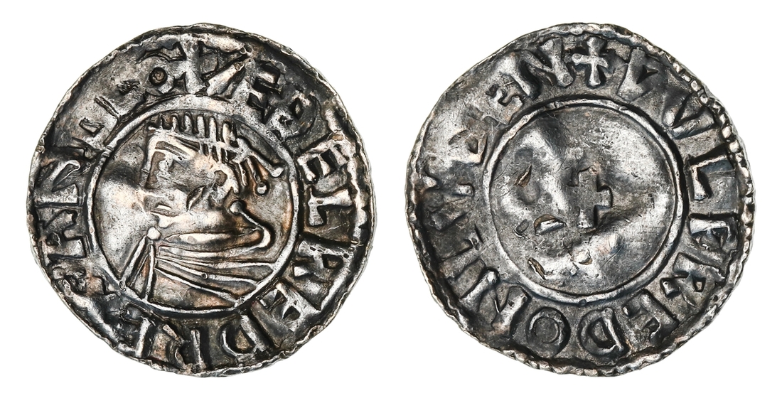 Æthelræd II 'Unræd' (978-1016), 'Last Small Cross' Type, Penny, 1009-1016, London, Wulfræd, diademed and draped bust left, rev. + VVLFRED ON LVDEN, small cross, 1.66g [25.62grns], 3h (SCBI 7 [Copenhagen], 958; SCBI 42 [South Eastern], 1013; SCBI 50 [Hermitage, Part I], 1353 same dies-1355; SCBI 51 [Estonia], 455; SCBI 65 [Norway, Part I], 1413; SCBI 68 [Lyon], 887; EMC 1986.5036; North 777; BMC I; S.1154), slight creasing and rippling to the flan, peckmarks present, occasional softness, nicely toned, near very fine