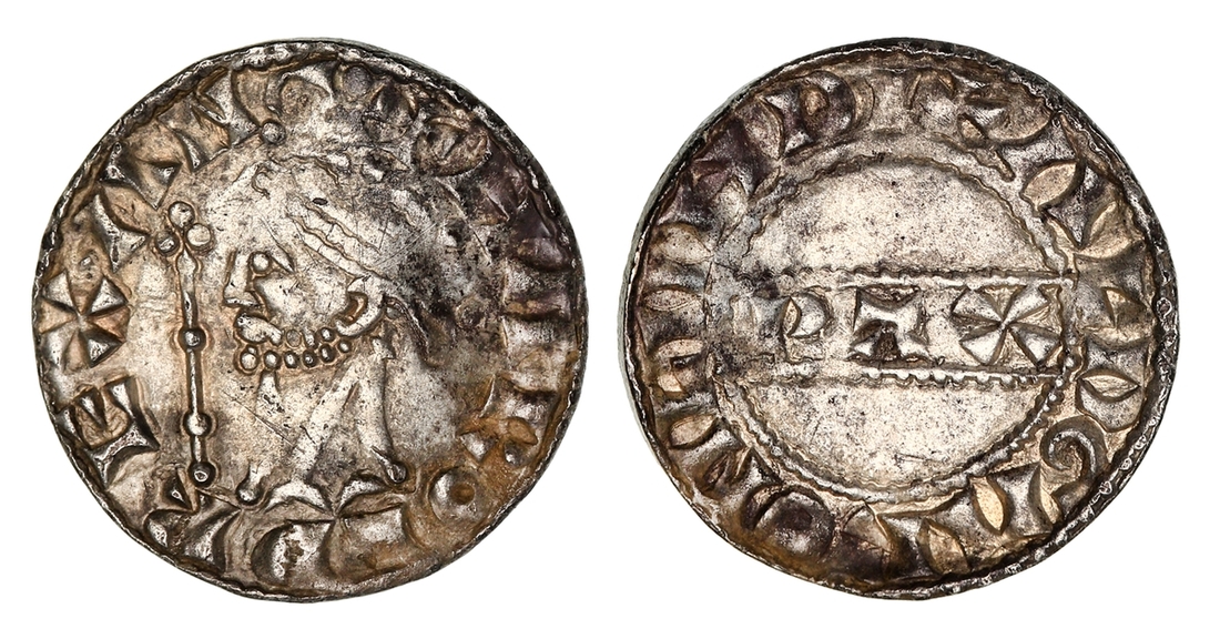 Harold II Godwinesson (5 January - 14 October 1066), 'PAX' Type with Sceptre, Penny, 1066, London, Aldgar, + HAROLD REX ANG, crowned head left, beard of two rows of small pellets, in front a sceptre tipped with a quatrefoil of pellets and a further pellet at bottom and middle of sceptre shaft, rev. + ALDGAR ON LVNDI, commencing at 1 o'clock, across field and between two pelleted lines, PAX, within beaded inner circle, 1.28g [19.75grns], 12h (Braintree Hoard 62 this coin, struck from the same dies as 63; Pagan, NM p.192 [seven examples noted]; SCBI 2 [Glasgow], 1198; SCBI 68 [Lyon], 1035; North 836; BMC I; S.1186), slightly bowed flan, otherwise toned with hoard patina, about very fine