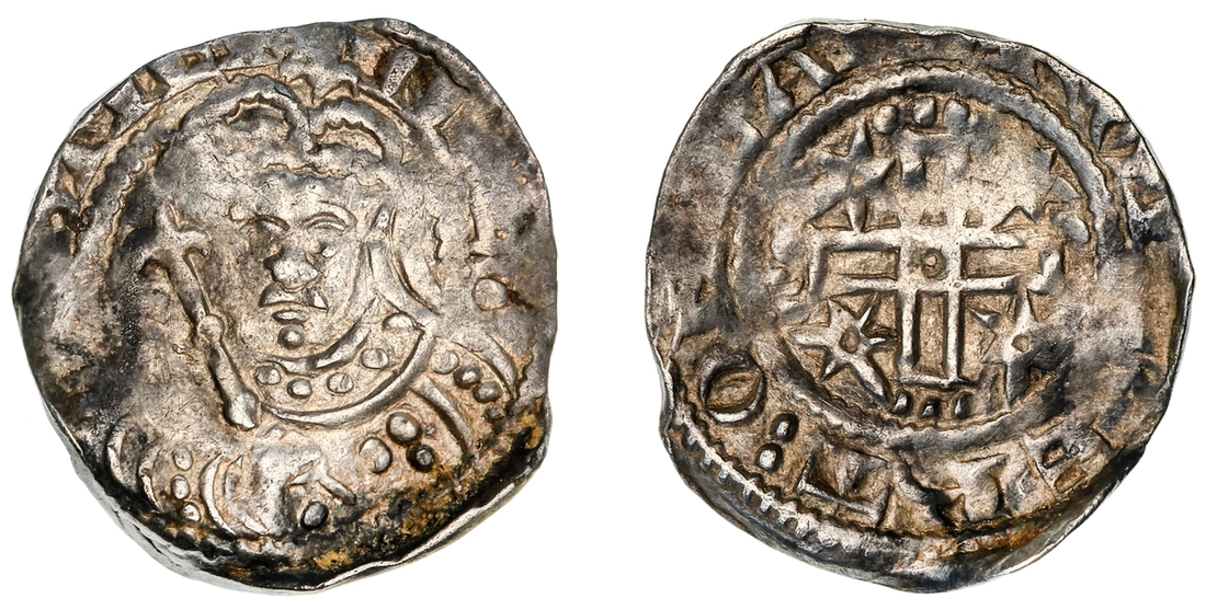 Stephen of Blois (1135-1154), 'Voided Cross and Mullets' Type, Penny, Canterbury, Robert, crowned bust three-quarters left, holding sceptre in right hand, rev. [...]ERT : ON CA[NT], plain cross voided with a mullet in each angle, 1.39g [21.45grns], 3h (SCBI -; EMC -; North 878; S.1280), flan warped with bent rim, otherwise good very fine for the type