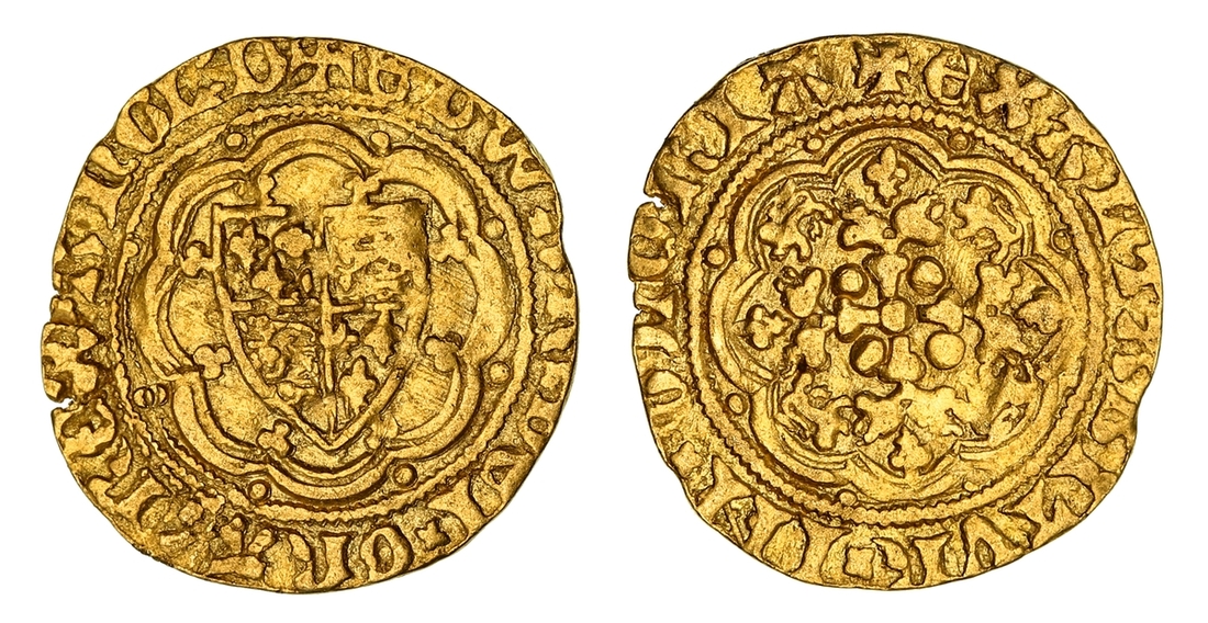 Edward III (1327-1377), Fourth-Coinage, Transitional Treaty Period, Quarter-Noble, 1361, London, (m.m.) EDWAR .' DEI . GRA : REX : ANGL : D, double saltire stops, quartered shield of arms in tressure of eight arcs, trefoils on cusps, trefoils in spandrels, rev. (m.m.) EXALTABITVR : IN : GLORIA, double saltire stops, pellet in centre of ornate cross potent with lys terminals, pellets within each inner angle, lion within each outer angle, all within beaded and linear tressure of eight arcs, pellets in spandrels, 1.82g [28.09grns], 5h, m.m. cross potent (Schneider I, 73; North 1224; S.1501), clipped, a touch of softness throughout, near very fine