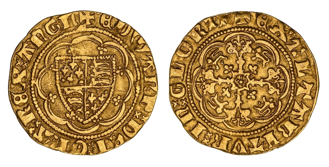 Edward III (1327-1377), Fourth Coinage, Treaty Period, Quarter Noble, 1361-1369, Tower, (m.m.) EDWARD : DEI : GRA : REX ANGL, annulet before, Royal shield in tressure of eight arches, trefoils on cusps, rev. floriated cross, lys at centre, double saltire stops, 1.82g [28.09grns], m.m. cross potent (Schneider I, 90-91; North 1244; S.1511), slightly clipped, a touch of softness throughout but even, very fine