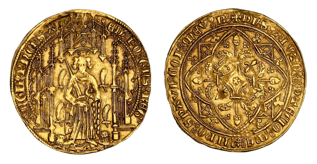 Anglo-Gallic, Edward the Black Prince (1362-1372), First Issue, Noble Guyennois à la rose (Pavillon d'Or), c. 1362-1363, Bordeaux, ED : PO : GNS : REG ANGL : PNCPS : A, double voided quatrefoil stops, Prince standing holding sword, beneath ornate portico, ostrich feathers at sides, lions at feet, rev. + DNS : AIVTO :Z: PTECTO : ME :Z: IIPO : SPAVI : COR : MEV : R :, double voided quatrefoil stops, cross quernée within ornamental quatrefoil, fleur-de-lys in second and fourth quarters, lions in first and third quarters, rosette at centre, trefoils in outer spandrels, 5.33g [82.25grns], 12h (Schneider III, 40-41; Elias 149a; S.8123), soft of strike to the portrait, yet well-centred to a pleasingly full flan, very fine