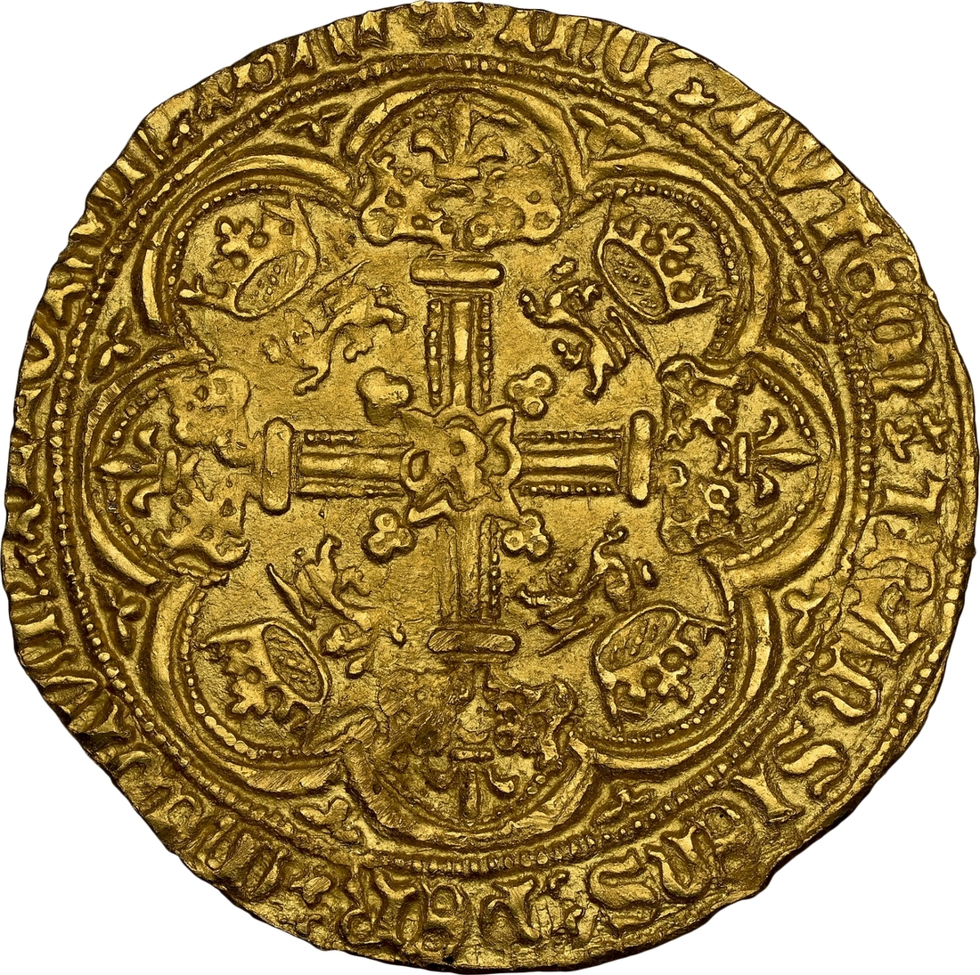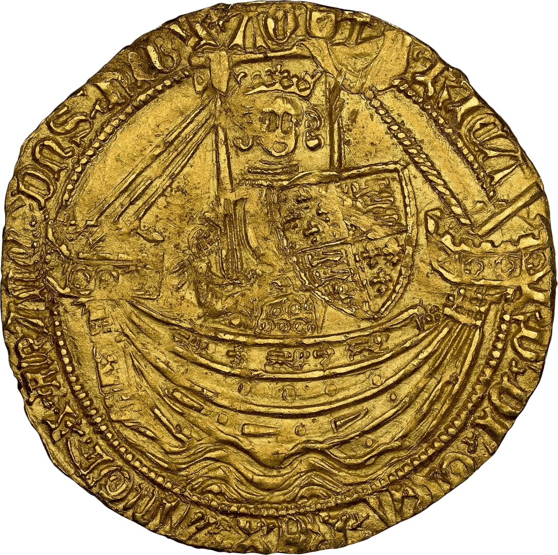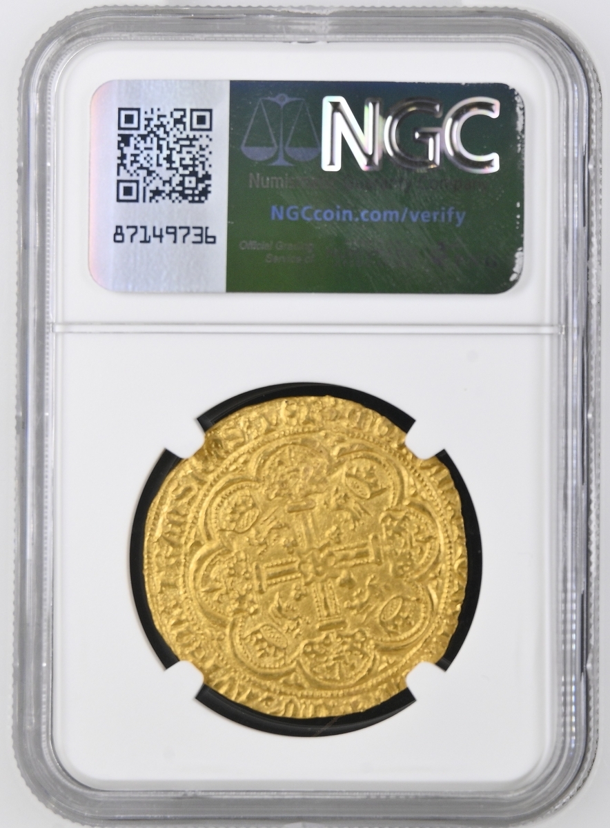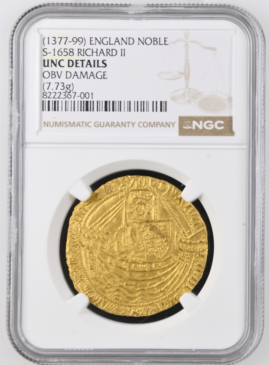 NGC UNC | Richard II (1377-1399), Type IIIa, Noble, London, RICA | RD . DI . GRA . REX . ANGL . Z : FRANC .' DnS .' hIB ' Z . AQT, saltire stops, King in shop holding a sword and shield, rev. (m.m.) IhC .' AVTEM : TRANSIENS : PER : MEDIV : ILLORVM: IBAT, saltire stops, ornate cross, lion and crown in each angle, all within tressure, trefoils in spandrels, R at centre, 7.74g [119.45grns], 5h (Schneider I, 182; North 1304; S.1658), some marks, double struck at 6-9 o'clock, uncirculated, about very fine, in NGC holder, graded UNC Details ~ Obv. Damage (Cert. #8222367-001)