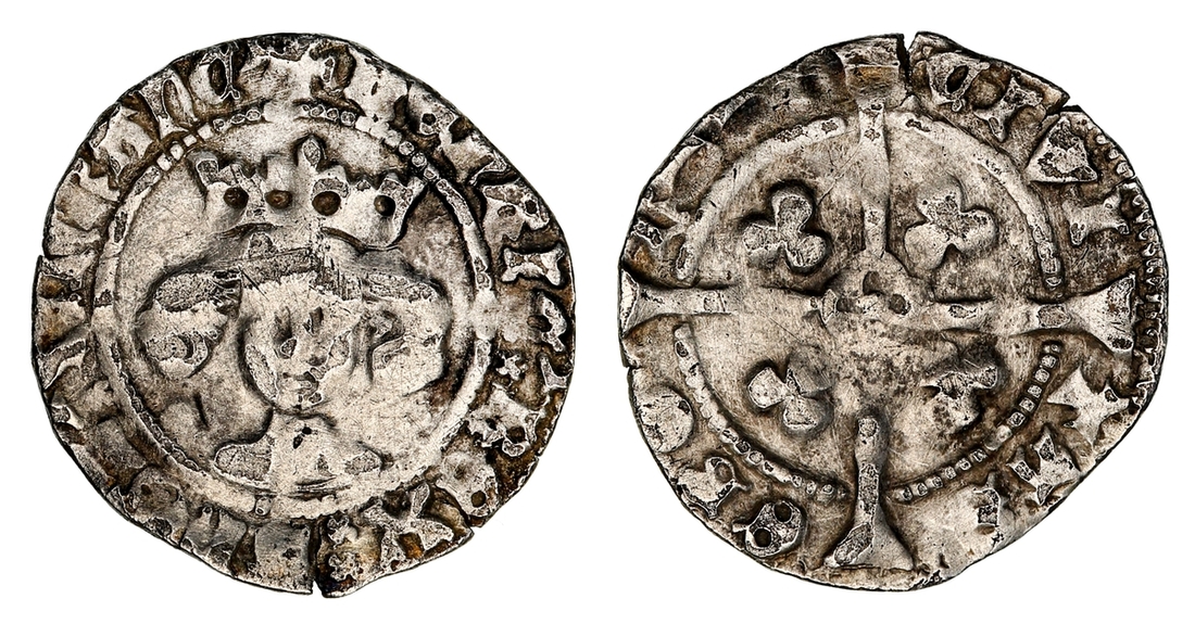 Henry IV (1399-1412), Heavy Coinage, Penny, York, hENRIC .' REX : ANGL : Z : FRANC, Archbishop Scrope or Bowet, crowned bust facing, with 'fluffy' hair, rev. CIVITAS EBORACI, long cross and trio of pellets in angles, quatrefoil at centre, 1.04g [16.05grns], 6h (North 1350; S.1722), two small flan splits, wear with some blundered areas of details, very rare, near very fine