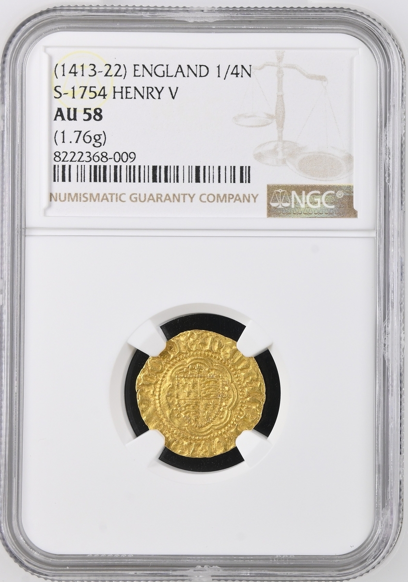 NGC AU58 | *Top Pop* | Henry V (1413-1422), Quarter Noble, Tower, Class A, + hENRIC : DI : GRA .' REX . AnG Z . F, large trefoils at points of tressure, lys above shield, trefoils beside, annulets beneath, rev. + EXALTABITVR : In : GLORIA, stars at angles of centre panel, m.m. pierced cross and pellet, 1.76g [27.16grns], 8h (Schneider I, 213; Brooke A(I); North 1381/1; S.1754), ever so slightly clipped, bold and detailed, good very fine, in NGC holder, graded AU58 *Top Pop* (Cert. #8222368-009) [*Single Finest Certified*]
