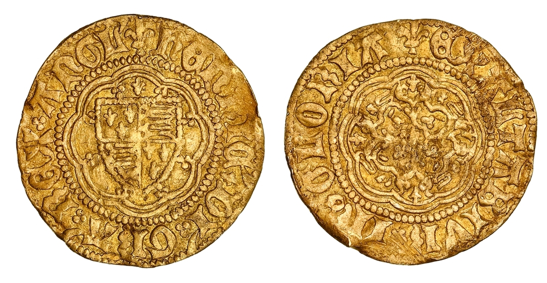 Henry VI, First Reign (1422-1461), Annulet Issue, Quarter-Noble, 1422-1427, London, (m.m.) hENRIC '• DI •' GRA '• REX • ANGL ', trefoil stops, shield in tressure of eight arcs, lys above, rev. (m.m.) EXALTABIVR * In • GLORIA, mullet after EXALTABIVR, short cross fleury atop voided quatrefoil, trefoils on tips, lys in forks, leopards in angles, all in double tressure of eight arches, spandrels plain, 1.65g [25.46grns], 2h (Schneider I, 295; North 1420; S.1810), slight warping at the edges, light wear throughout, otherwise near very fine