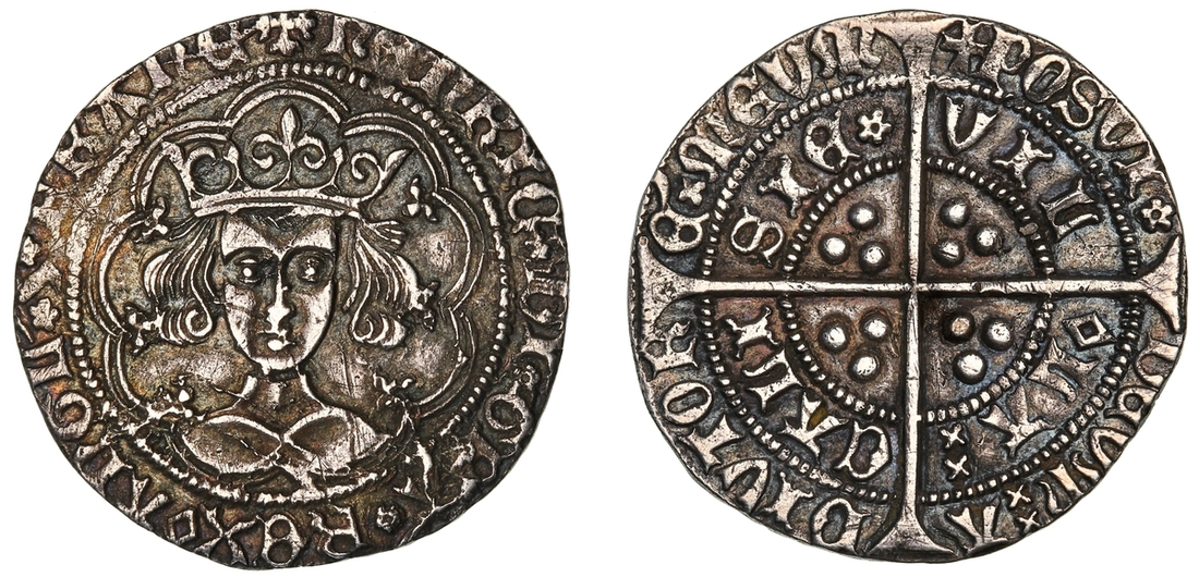 Henry VI, First Reign (1422-1461), Groat, Rosette-Mascle Issue, Calais, crowned facing bust, rev. long cross pattée, trio of pellets in angles, 3.72g, [57.46gns], 3h (North 1446; S.1859), die flaw to bust and some hairline scratches, otherwise a pleasing and uniform strike, about very fine