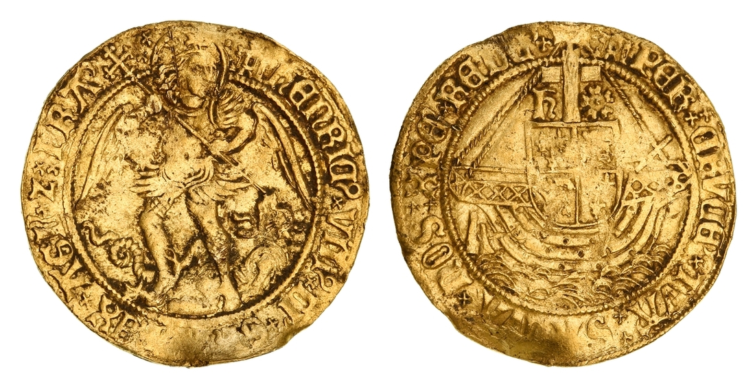 Henry VIII (1509-1547), First Coinage, Angel, Tower, 1509-1526, (m.m.) hENRIC ' . VIII '. DI '. GRA '. REX . AGL . Z : FRA ', St Michael vanquishing the Dragon, saltire stops, rev. (m.m.) PER : CRVCE '. TVA ' : SALVA . nOS : XPE '. REDE., saltire stops, ship surmounted by square-topped shield and mast dividing h and Rose, 5.14g [79.32grns], 11h, m.m. castle (Schneider I, 557; North 1760; S.2265), a field find, with crimping and resulting softness to edges, nonetheless pleasingly struck up in parts, near very fine