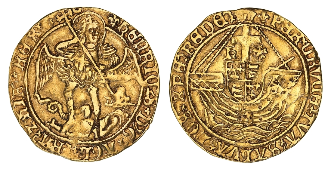 NGC AU | Henry VIII (1509-1547), Third Coinage, Angel, 1544-1547, (m.m.) hENRIC ?' 8 • D '. G '. AGL '. FRA '. Z • HIB '. REX :, slipped trefoil stops, St. Michael vanquishing Dragon, annulet behind head, rev. (m.m.) PER • CRVCE '. TVA '. SALVA • nOS • XPE '. REDE .', slipped trefoil stops, ship surmounted by square-topped shield and mast dividing h and rose, annulet on decking, 4.98g [76.85gns], 6h, m.m. lys (Schneider I, 622; North 1830; S.2299), some partial softness, yet with a light red tone and lustre, a bolder very fine, in NGC holder, graded AU Details (Cert. #8222399-006)
