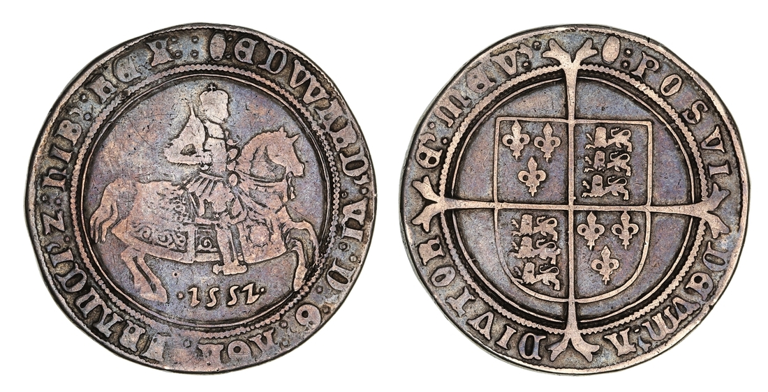 Edward VI (1547-1553), Third Period, Fine Silver Issue, Halfcrown, 1551-1553, Tower, : (m.m.) : EDWARD ': VI : D :' G :' AGL .' FRANCI '. Z : hIB ': REX :, 'Boy King' in armour, resting sword on right shoulder, feet in stirrups with protruding spurs, riding Berber horse dressed in caparison and crupper, curvetting right, date below, rev. (m.m.) : POSVI DEV .' ADIVTORE :' mEV :', square-topped shield over long cross fourchée, 30.19g [465.90grns], 2h, m.m. tun (North 1934; S.2479), flatness to central devices and legends, with a largely uniform tone in blue and ochre, bolder fine