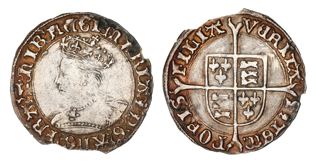 Mary, Solus (1553-1554), Groat, Tower, crowned bust left, wearing simply-jewelled plain bodice and pearl necklace, rev. square-topped shield over long cross fourchée, 1.84g [28.44grns], 6h, m.m. pomegranate (North 1960; S.2492), chipped to flan at 6 o'clock and to R in legend, hairline scratches to reverse, doubling to the portrait, nonetheless a uniform strike, with toning within legends, strict very fine