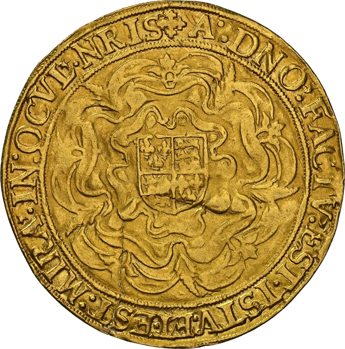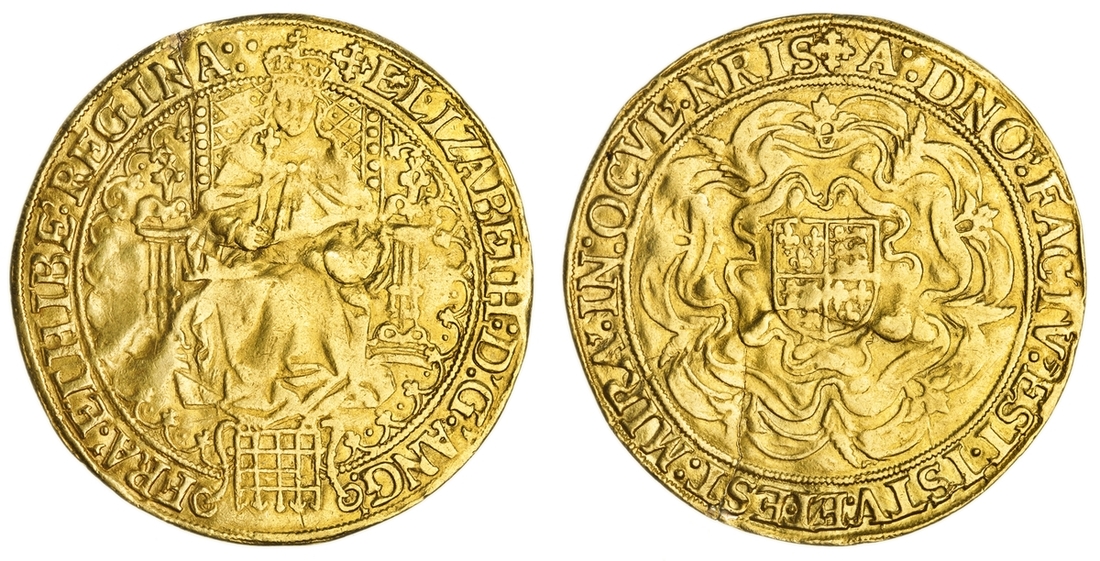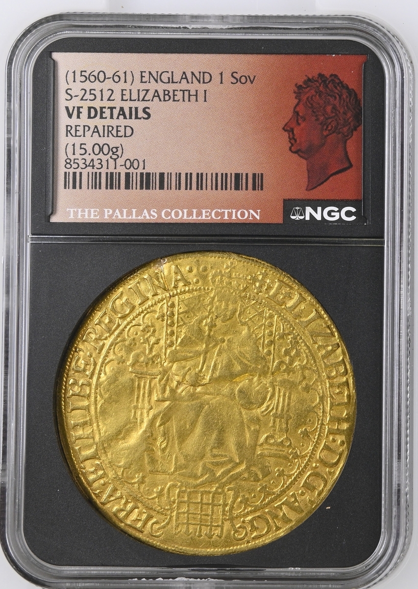 (x) NGC VF | Elizabeth I (1558-1603), First Issue, Double Rose Noble of 30-Shillings or Fine Sovereign, 1 January 1561 - 31 October 1562, Tower, (m.m.) ELIZABETH : D'. G'. ANG'. FRA'· ET HIBE'· REGINA :· Queen seated on ornamented throne, adorned with fine lattice work enclosing pellets, pillars decorated with five larger pellets, holding orb and sceptre, portcullis with chains below, breaking ornate tressure, rev. (m.m.) A ·. DNO'. FACTV.' EST · ISTV.' ET · EST .· MIRA'· IN : OCVL'· NRIS, ET over Z, Royal arms in centre of full-blown Tudor Rose, spandrels plain, 14.970g [231.02grns], 6h, m.m. cross crosslet [over lys on reverse] (Dudman 70 same dies; Raynes 115 same dies; Lockett 1949 = Hird I, 29 = AHH Virtual 64, same dies; Brown & Comber A4; Holloway 04-03A [10 Known]; Schneider I, 730 same dies; North 1978; S.2512), a striking crack through N of REGINA running parallel down the outer left pillar and subsequently lightly filled at rim, otherwise subtly crimped across honey-golden original fields, the centres bolder than fine, the peripheries very fine, a prized rarity with only ten recorded specimens, in NGC Black 'Pallas' holder, graded Very Fine (Cert. #8534311-001)