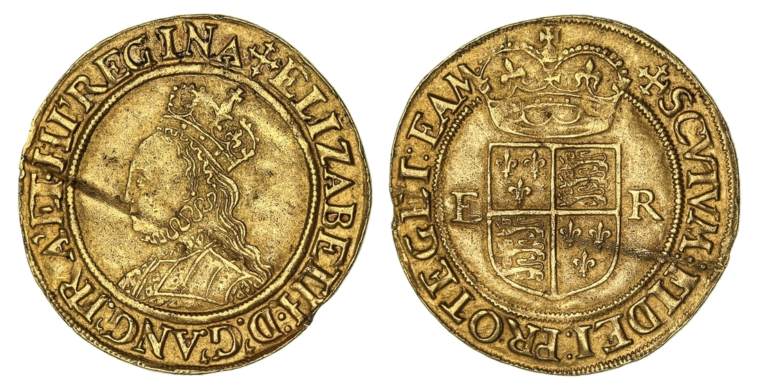 Elizabeth I (1558-1603), First Tentative Issue, 'Crown Gold', Half-Pound, 1 January 1561 - 31 August 1565, Tower, + ELIZABETH : D .' G .' ANG .' FRA .' ET . HI .' REGINA, crowned bust 3C left, wearing decorated bodice, rev. + SCVIVM : FIDEI : PROTEGET : EAM ., crowned square-topped shield, dividing E-R, 5.59g, [86.27grns], 10h, m.m. cross-crosslet (Schneider I, 738; Brown & Comber G5/G6; North 1982; S.2520), creased and straightened, bold strike for legends, a few small nicks but otherwise very fine
