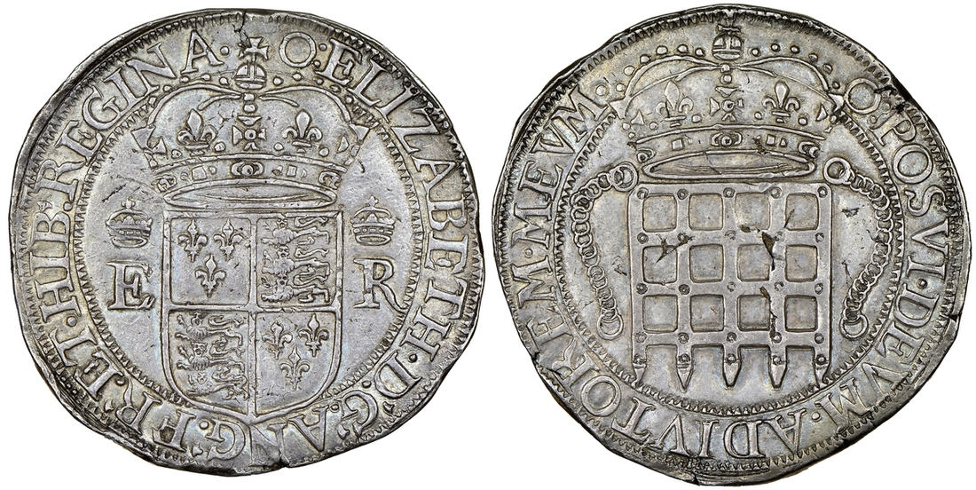 (x) NGC AU55 | Elizabeth I (1558-1603), Portcullis Money, Eight-Testerns, undated (1600-1601), ELIZABETH. D.' G.' ANG.' FR.' ET. HIB.' REGINA., toothed borders and inner circles both sides, crown over plain square topped shield dividing crowned E-R, rev. POSVI . DEVM . ADIVTOREM . MEVM., crown over portcullis, 27.55g [425.16grns], 10h, m.m. O both sides (Prid.1; S.2607A), some metal flaws otherwise a handsome example, almost extremely fine, very rare, in NGC 'Waterbird' holder, graded AU55 (Cert. #4861777-004)