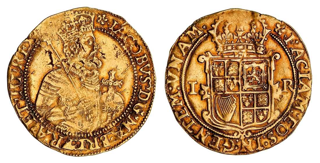 James I (1603-1625), Second Coinage, Unite, 1613-1615, Tower, • (m.m.) • IACOBVS .' D .' G .' MA .' BRI .' FRA .' ET .' HI .' REX, fourth crowned bust right, wearing plain armour, holding orb and shouldering sceptre, rev. (m.m.) • FACIAM • EOS • IN • GENTEM • VNAM • crowned and garnished shield, dividing I-R, 9.81g [151.39grns], 2h, m.m. cinquefoil (Schneider II, 28; North 2085; S.2620), flan stress with daylight hole behind the sceptre, worn dies and clipped edges, some discolouration, reverse much bolder, a good fine