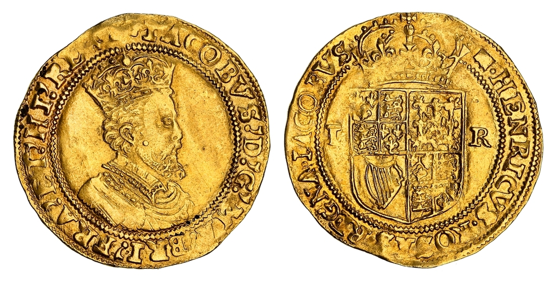 James I (1603-1625), Second Coinage, Double-Crown, 1618-1619, Tower (m.m.) • IACOBVS .' D '. G '. MA '. BRI '. FRA '. ET '. HI '. REX • fifth crowned bust right, rev. • (m.m.) • HENRICVS • ROSAS • REGNA • IACOBVS, crowned shield, dividing I-R, 5.04g [77.78grns], 7h, m.m. book on lectern (cf. Schneider II, 31-42, this mintmark not listed; North 2089; S.2623), uneven edges with areas of blundered detail, otherwise with a rich honey-golden tone, a rare mintmark, good fine to very fine