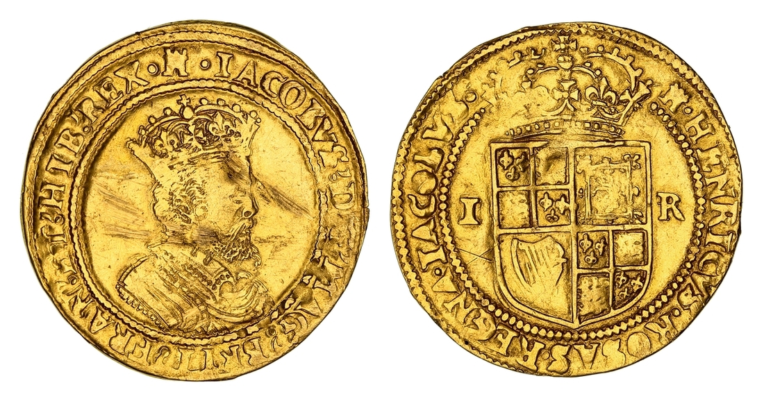 James I (1603-1625), Second Coinage, 'Crown Gold' Issue, 1612-1613, Double-Crown, . IACOBVS .' D .' G .' MAG.' BRIT .' FRAN .' ET .' HIB .' REX., fifth crowned and cuirassed bust right, rev. . HENRICVS : ROSAS . REGNA . IACOBVS, crowned square shield dividing I-R, 4.81g [74.23grns], 10h, m.m. tower (Schneider II, 35-39; North 2088; S.2623), quite harsh scuffs on the obverse, clipped edges, graffito X on the reverse, otherwise bold details, good fine