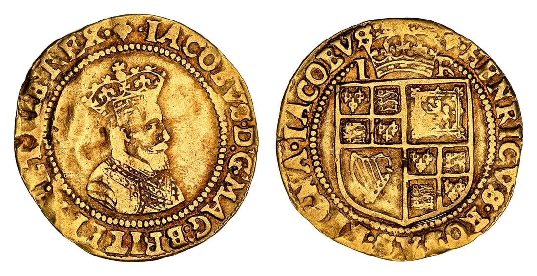 James I (1603-1625), Second Coinage, Britain Crown, Tower, • (m.m.) • IACOBVS D .' G .' MAG BRIT .' FRA .' ET • HIB • REX, first crowned and armoured bust right, rev. (m.m.) • HENRICVS • ROSAS • REGNA • IACOBVS, crowned square-topped shield, dividing I-R, shield with four strings, 2.34g [36.11grns], 10h, m.m. grapes (Schneider II, 47; North 2090; S.2624), areas of softness throughout the coin, slightly clipped, and just wrinkled, otherwise good fine
