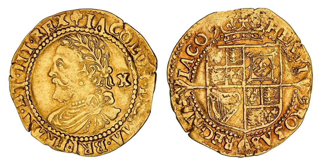 James I (1603-1625), Third Coinage, Crown Gold Issues, Half-Laurel, 1624, Tower, (m.m.) IACOBVS D : G : MA • BRI • FRAN : ET HI : REX, laureate, draped and cuirassed fourth bust left, X behind, rev. HENRI 9 ROSAS REGNA (m.m.) IACO 9, hook shaped (9) abbreviation marks after HENRIC and IACO, no stops, long cross fleury over large crowned square-topped Royal shield, harp, 4.46g [68.83grns], 8h, m.m. trefoil (Schneider II, 92; North 2117; S.2641A), a few small flan splits, uneven and worn edges and some small areas of blunder to detail, otherwise lightly toned, pleasing portrait, good fine