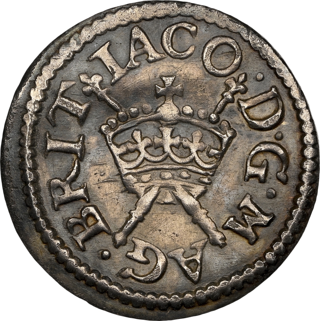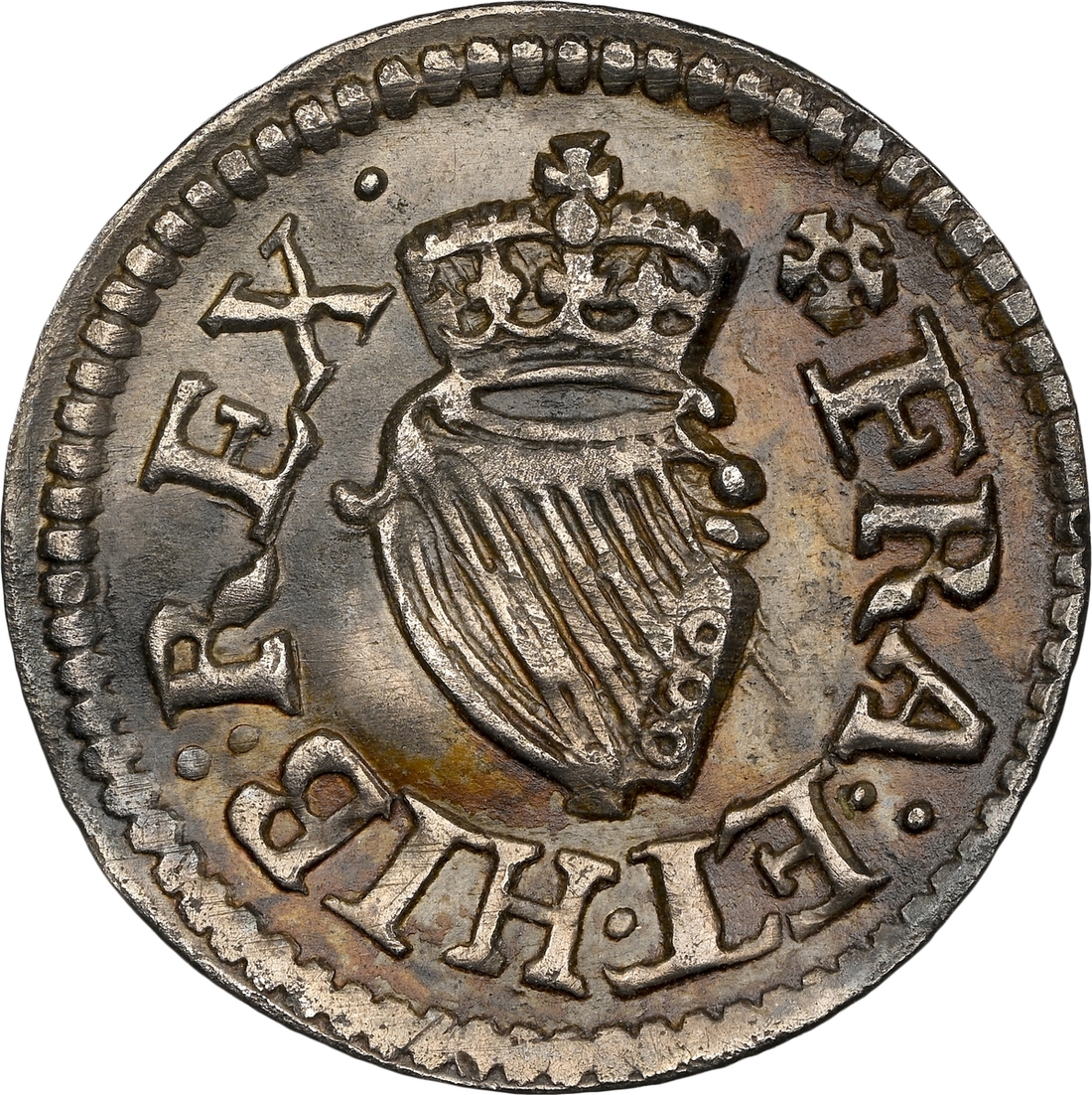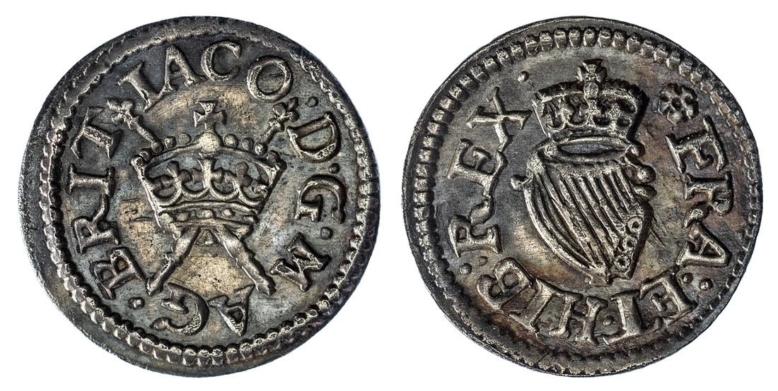 James I (1603-1625), Presentation Striking[?] Farthing in Silver, Harington type 2, c.1613-1615, IACO · D · G · MAG · BRIT, crown over sceptres centrally with legend around, rev. FRA : ET · HIB : REX ·, crowned harp centrally with legend around, m.m. cinquefoil, [Spink XRF, Obverse: 91.02% Ag, 3.41% Fe, 4.19% Cu, 1.01% Au, 0.37% Pb; Reverse: 80.21% Ag, 13.89% Fe, 4.42% Cu, 0.99% Au, 0.49% Pb], 0.92g [14.20grns], 6h (T. Everson, A Newly Discovered Silver Farthing of James I (2018); BMC [Peck] -; cf. S.2676A), the only silver example known, UNIQUE and likely a presentation piece to the King, hardly worn on round and even flan, XRF reveals the coin was potentially gilt at one point, extremely fine