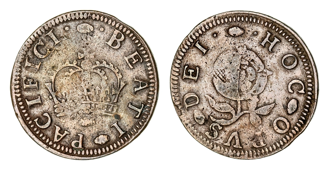 James I (1603-1625), Pattern Halfpenny[?] or Trial Striking in Copper, undated, BEATI PACIFICI, small tun between each word, in centre a crown with small tun below, rev. HOC OPUS DEI., small tun between each word, in centre a thistle and rose dimidiated, edge plain, 4.54g [70.06grns], 7h (North 2139; BMC [Peck], -; S.-), more usual to find these pieces on a rectangular copper blank, but this one has been cut, softness to the central devices but otherwise very fine, extremely rare