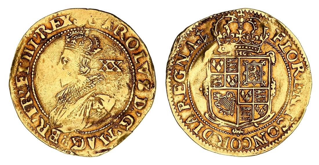 Charles I (1625-1649), Group B, Class Ia, Unite, 1628-1629, Tower (under King), (m.m.) CAROLVS D .' G .' MAG .' BR .' FR .' ET HI .' REX, second crowned bust left, wearing picardil, value behind, rev. FLORENT CONCORDIA REGNA (m.m.), no stops, crowned and garnished square-topped shield, 8.80g [135.81grns], 8h, m.m. anchor (Brooker 44-52; Schneider II, 124-125; North 2148; S.2687), wiped and evidence of mounting, deep crimp through bust, soft in parts nonetheless pleasing to shield, good fine / very fine