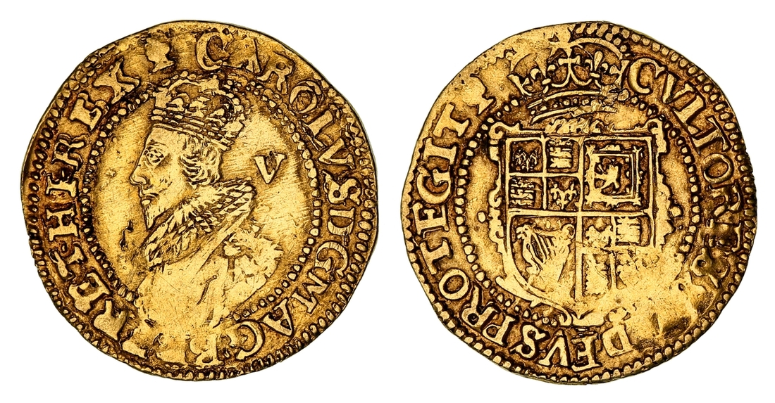 Charles I (1625-1649), Group B, Gold Crown, 1626-1627, Tower (under King), (m.m.) CAROLVS D G MAG BR . FR . ET . HI . REX, beaded inner circle, second crowned and mantled bust left, value behind, rev. CVLTORES SVI DEVS PROTEGIT (m.m.), no stops, crowned square-topped shield, 2.23g [34.41grns], 1h, m.m. African head (Schneider II, 227; North 2181; S.2711), areas of softness and some dark deposits, but otherwise very fine