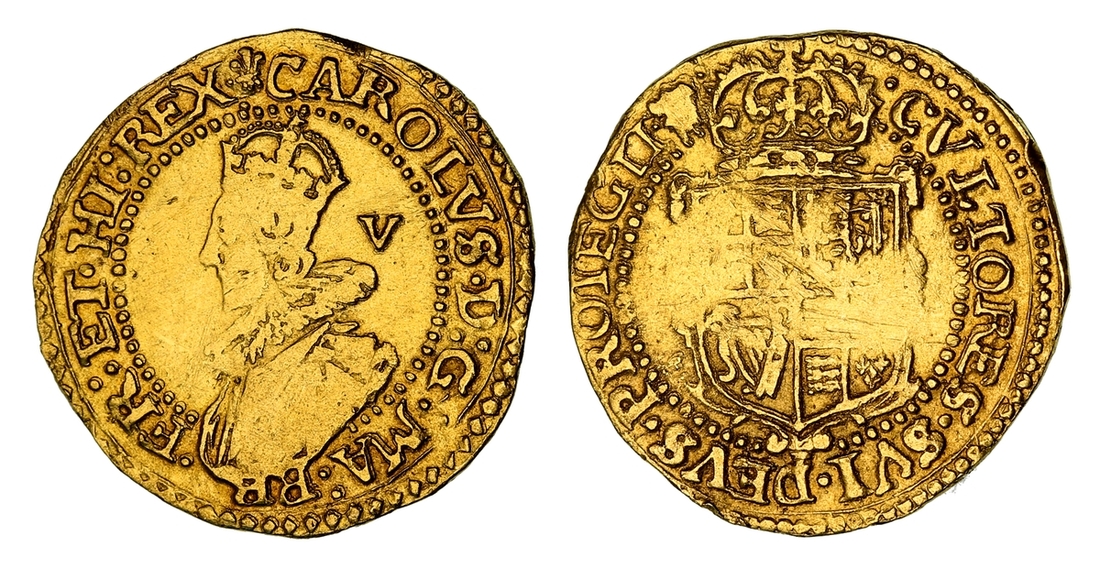 Charles I (1625-1649), Group B, Class II, Gold Crown, 1638-1639, Tower (under King), smaller single-arched third crowned bust left, wearing ruff, mark of value behind, rev. crowned square-topped shield, 2.25g [34.72grns], 12h, m.m. plumes (Schneider II, 236; North 2182; S.2712), smoothed edges, cleaned, worn reverse die, fine