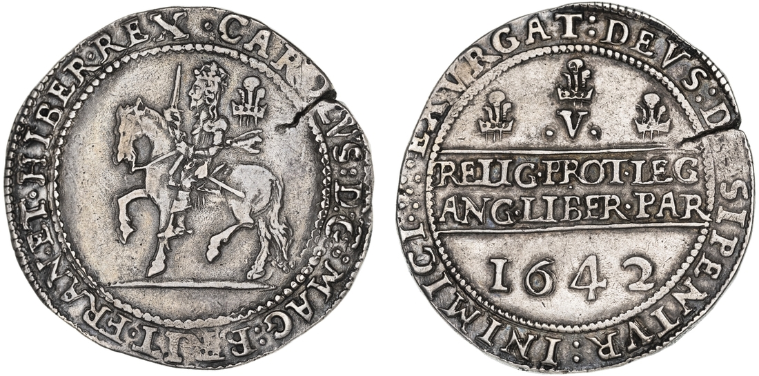Charles I (1625-1649), Civil War Issues, Shrewsbury, 'Declaration' Crown, 1642, • CAROLVS : D : G : MAG : BRIT • FRAN • ET • HIBER • REX, King on horseback left, ground line below, plume behind, rev. •:•:• EXVRGAT : DEVS : DISSIPENTVR : INIMICI | RELIG • PROT • LEG | ANG • LIBER • PAR in two lines, value and three Shrewsbury plumes above, 1642 below, 29.46g [454.64grns], 8h, i.m. pellet / seven pellets (Morrieson B-5; Brooker 809; North 2370; S.2926), striking crack in flan at 2 o'clock and areas of softness to legends where lightly doubled, otherwise with a pleasant uniform tone, very fine, an imposing example of this iconic Civil War 'Cartwheel' coinage!