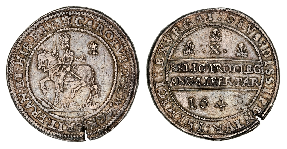 Charles I (1625-1649), Civil War Issues, Royalist Oxford, 'Declaration' Half-Pound of 10-Shillings, 1642, (m.m.) CAROLVS : D : G : MAG N : BRIT : FRAN : ET : HIB : REX ·, Shrewsbury horseman riding left, holding upright sword, trampled arms below, plume behind, rev. EXVRGAT : DEVS : DISSIPENTVR : INIMICI : | RELIG · PROT · LEG | ANG · LIBER · PAR in two lines, three even Oxford plumes and · X · above, date below, 60.31g [930.74grns], 2h, m.m. plume (Morr. A-1; Brooker 866; North 2404; S.2944), striking-split to flan at 6 o'clock and lightly graffitied X in obverse field, doubling to legends and devices, with a light tone, very fine, an imposing example of this iconic Civil War issue