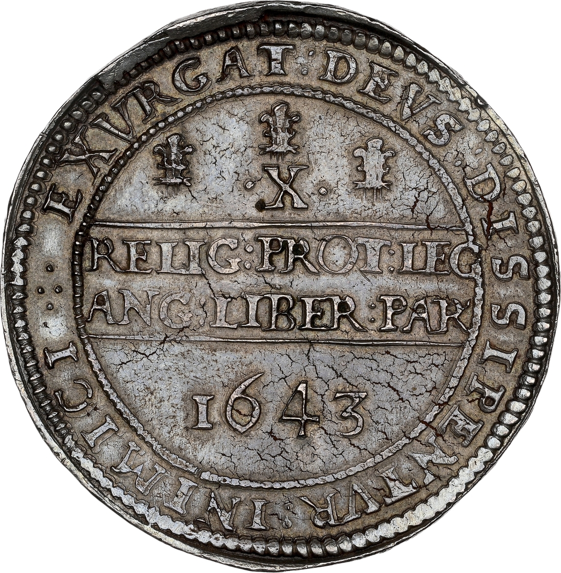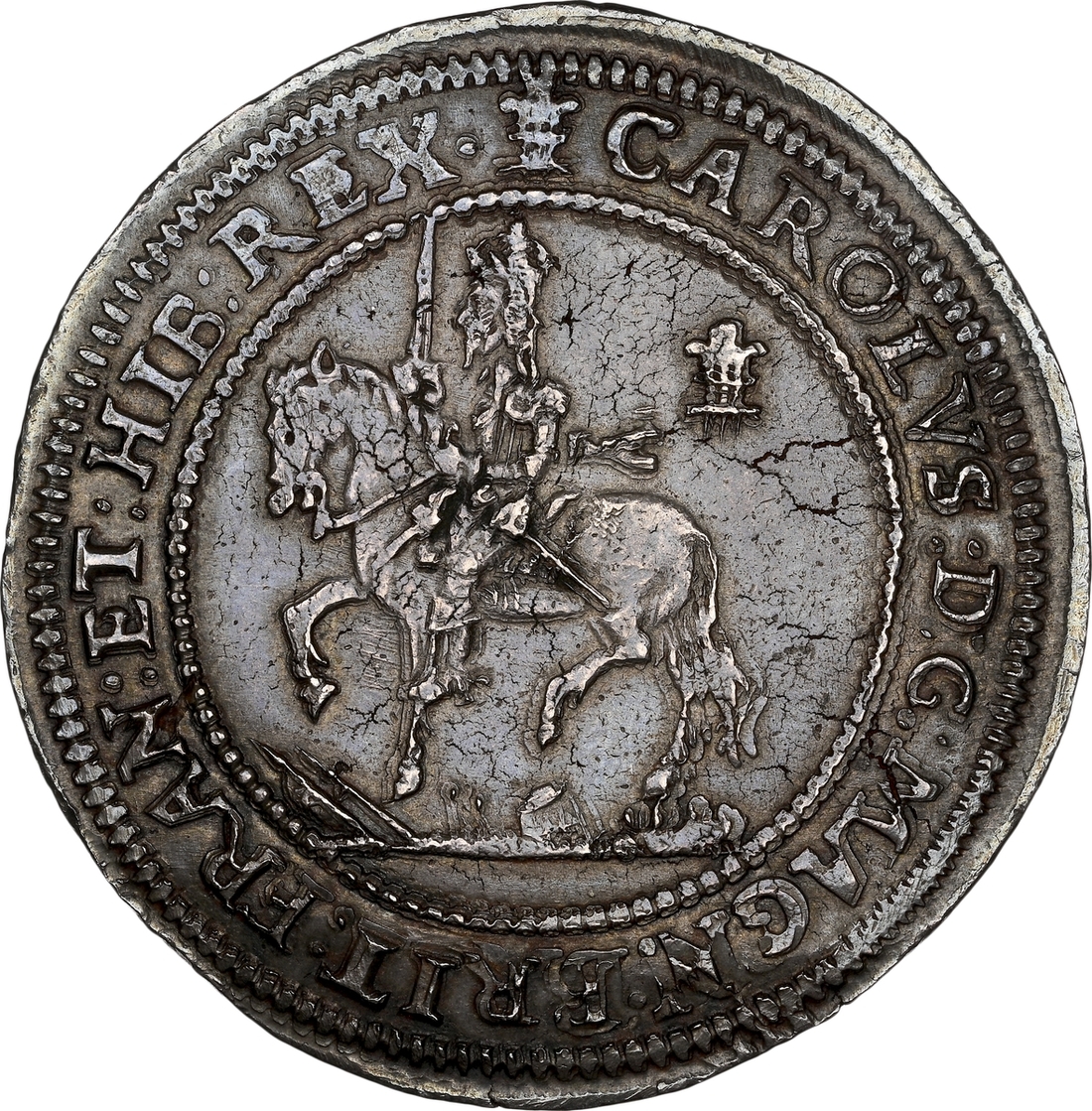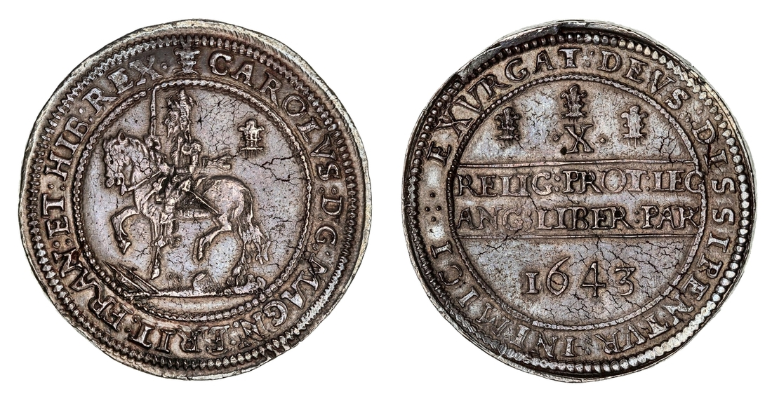 NGC MS62 | *Top Pop* | Charles I (1625-1649), Civil War Issues, Royalist Oxford, 'Declaration' Half-Pound of 10-Shillings, 1643, (m.m.) CAROLVS : D : G : MAG N : BRIT : FRAN : ET : HIB : REX ·, Shrewsbury horseman riding left, holding upright sword, trampled arms below, plume behind, rev. EXVRGAT : DEVS : DISSIPENTVR : INIMICI ·:· | RELIG : PROT : LEG | ANG : LIBER : PAR in two lines, three even Oxford plumes and · X · above, date below, 58.30g [899.92grns], 6h, m.m. plume (Morr. A-1; Brooker, Appendix I, 15; North 2404; S.2945A), metal stressing to an otherwise pleasingly full-flan, doubling to the obverse, more apparent within legend, otherwise a pleasing and largely uniform strike, with a handsome lustre and blue-tone to light-grey surfaces, areas of old red-wax visible, about extremely fine and rare thus, in NGC holder, graded MS62 *Top Pop* (Cert. #8222379-001) [*Single Finest Certified*]