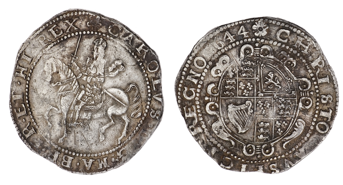 Charles I (1625-1649), Civil War Issues, Royalist Cornwall and Devon, Exeter (under Sir Richard Vyvyan), Halfcrown, 1644, (m.m.) CAROLVS • D G • MA • BR • FR • ET • HI • REX, horseman King trotting left, sword upright, sash in bow, with "twisted" tail, rev. (m.m.) CHRISTO AVSPICE • REGNO 1644, oval garnished shield, 13.92g [214.8grns], 3h, m.m. rose (Brooker 1052; North 2568; Spink 3075), scuffs below horse's body, with typical striking softness in parts, otherwise a most pleasing example of this scarce Provincial issue, the King's armour particularly well-defined, the 'Twisted' tail wonderfully clear, excellent for type, good very fine thus, very rare, a recent single-find close to the discovery of the Crediton Church (1896) Trove
