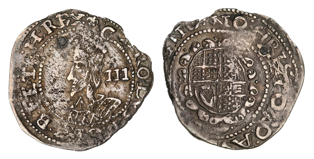 Charles I (1625-1649), Civil War Issues, Unattested Royalist Mint, Worcester or Shrewsbury [Salopia ?], Threepence, 1644, crude tall crowned bust left, III behind, rev. crowned shield, even garniture, 1.33g [20.62grns], 10h, m.m. lys (Brooker 1177-1178; North 2624; S.3117), pierced and subsequently filled, lightly pitted to an irregular flan, about very fine, very rare