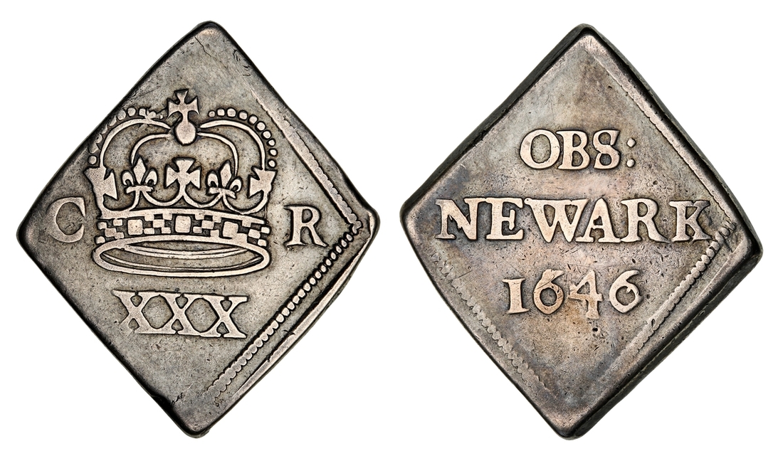 Charles I (1625-1649), Civil War Issues, Royalist Newark Besieged, Halfcrown, 1646, large crown dividing C-R, rev. OBS : | NEWARK | 1646 in three lines, 13.46g [207.72grns], 12h (Brooker 1222; Bull 687; North 2638; S.3140A), cleaned and subsequently retoned to peripheries, light bagmarks to reverse, otherwise a uniform strike and well-centered, very fine, a fine example of this fabled lozenge Siege coinage