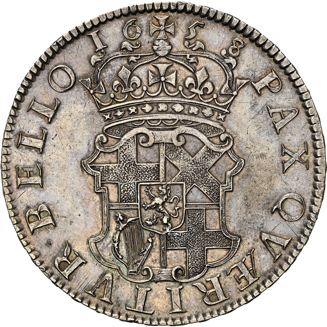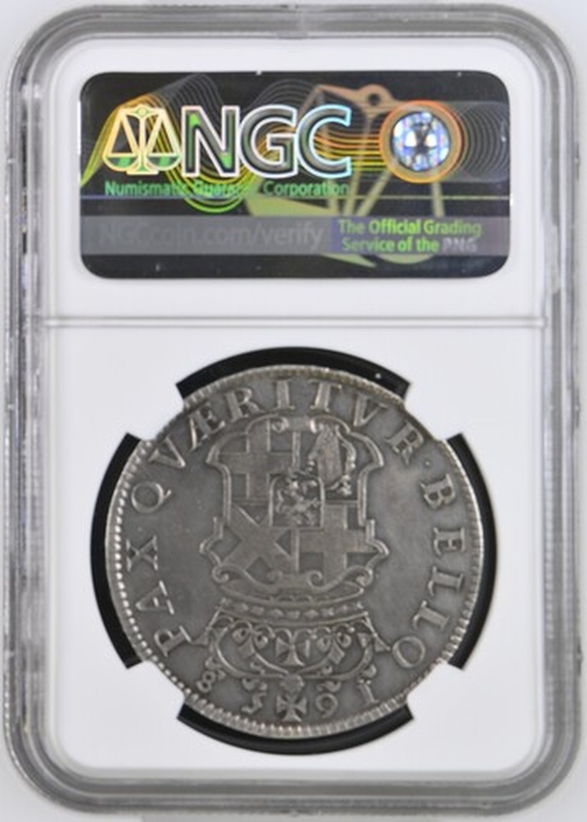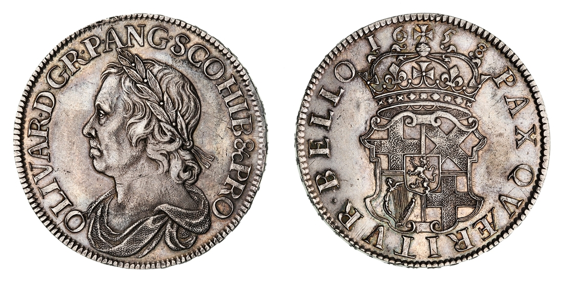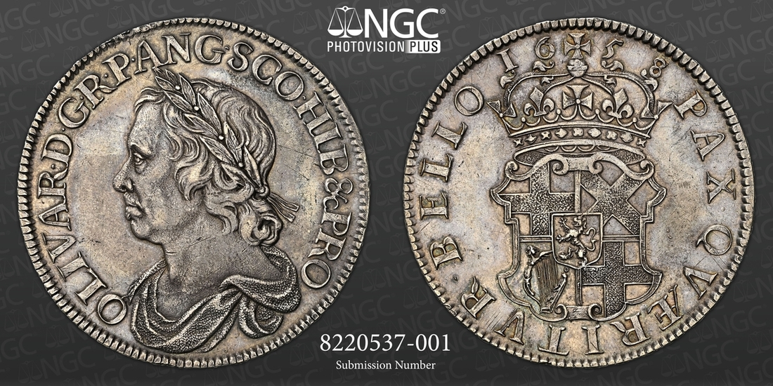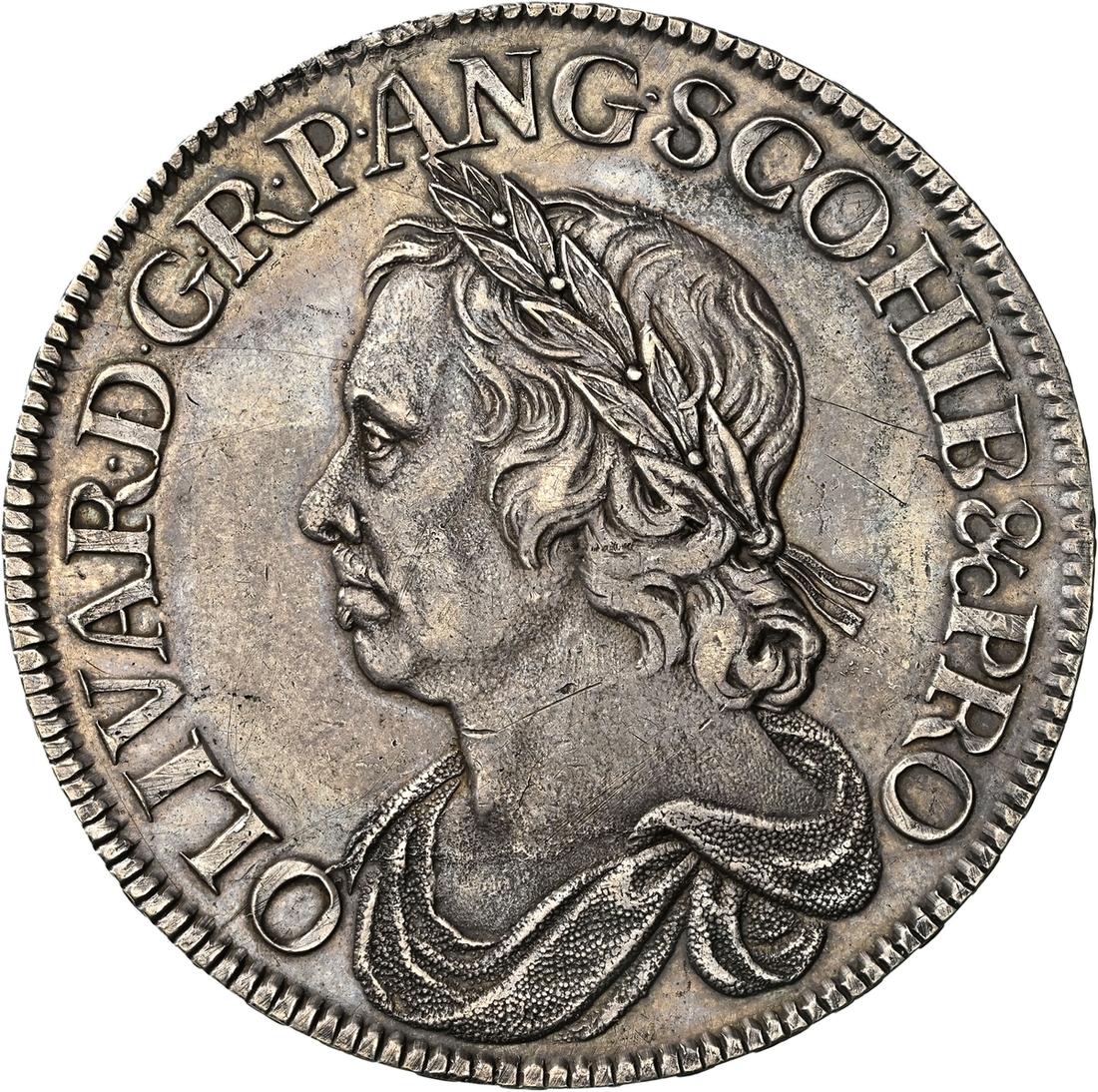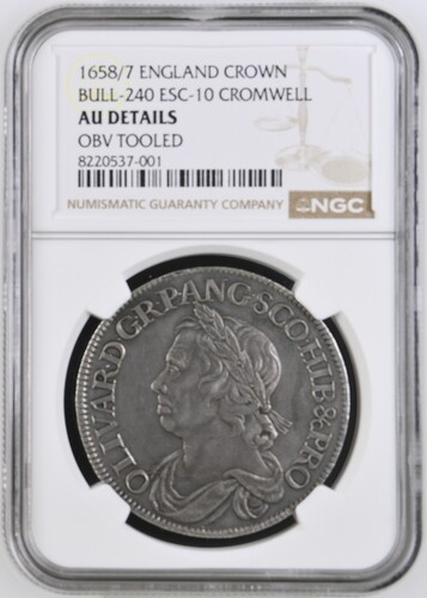 (x) NGC AU | Oliver Cromwell, Crown, 1658 over 7, Tower, by Thomas Simon, OLIVAR • D • G • R • P • ANG • SCO • HIB &c PRO, laureate and draped bust left, rev. PAX • QVÆRITVR • BELLO, crowned shield of the Protectorate, • HAS • NISI • PERITVRVS • MIHI • ADIMAT • NEMO • downwards on edge, 30.117g [464.78grns], 7h (L&S 1; ESC 10; Lessen E12; Bull 240; S.3226), lightly wiped with a small metal flaw to rim at 11 o'clock, otherwise cabinet toned and lustrous fields, a most pleasing balanced example of this famous Protectorate issue, almost extremely fine, an evidently early striking with scant evidence of the fabled die flaw, in NGC holder, graded AU Details (Cert. #8220537-001)