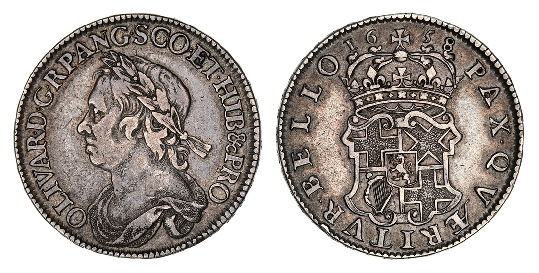 Oliver Cromwell, Halfcrown, 1658, Tower, by Thomas Simon, OLIVAR • D • G • R • P • ANG • SCO • HIB &c PRO, laureate and draped bust left, rev. PAX • QVÆRITVR • BELLO, crowned and garnished shield, + • HAS • NISI • PERITVRVS • MIHI • ADIMAT • NEMO • downwards on edge, 14.90g [229.94grns], 6h (ESC 447; Bull 252; Lessen 126; S.3227A), couple of minor edge bruises and softness to devices, with a residual lustre to uniform surfaces, about very fine