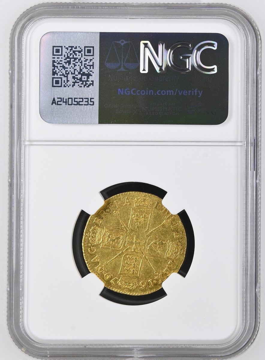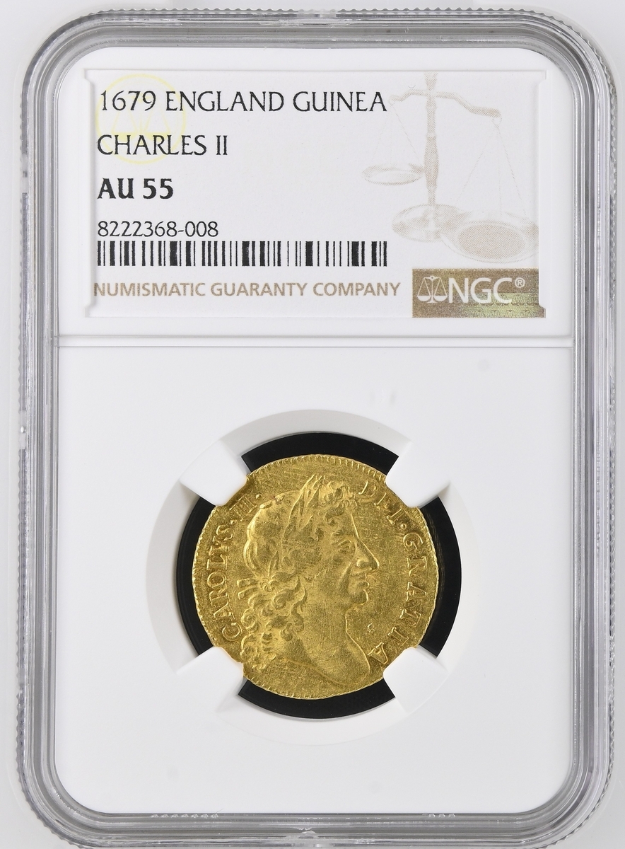 NGC AU55 | Charles II (1660-1685), Guinea, 1679, fourth laureate bust right with rounded truncation, rev. crowned cruciform emblematic shields, sceptres in angles, date either side of crown over English shield, edge grained, 8.32g, 6h (EGC 267; MCE 80; S.3344), light adjustment marks across the bust and at centre of reverse, otherwise lightly toned with underlying brilliance, very fine, reverse even better, in NGC holder, graded AU55 (Cert. #8222368-008)