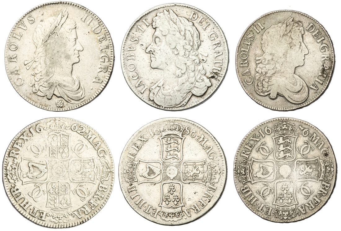 (x) Early Milled Crowns (3) | including, Charles II (1660-1685), Crowns (2); 'Rose' Issue, 1662, first draped and laureate bust right, rose below bust, stop above, rev. stop after HIB, crowned shields cruciform, eight strings to harp, undated and downwards lettered edge, letters widely spaced, 29.51g, 5h (ESC 15; Bull 339 but with stop after HIB; S.3350), rubbed and lightly toned, strictly good fine; another, 1676 VICESIMO OCTAVO, third bust right, six strings, upwards lettered edge, 29.58g, 6h (ESC 51; Bull 397; S.3358), metal flaw through AT of GRATIA and corresponding area of reverse, otherwise fine or marginally better for strike; lastly, James II (1685-1688), Crown, 1686 SECVNDO, no stops on obverse, first laureate and draped bust left, rev. crowned shields cruciform, five strings to harp, lettered edge downwards, 29.18g, 6h (Bull 741 five strings not noted; ESC 77; Spink 3406), haymarked and rubbed, otherwise residually lustrous, a bolder fine, the variety scarce and popular (3)