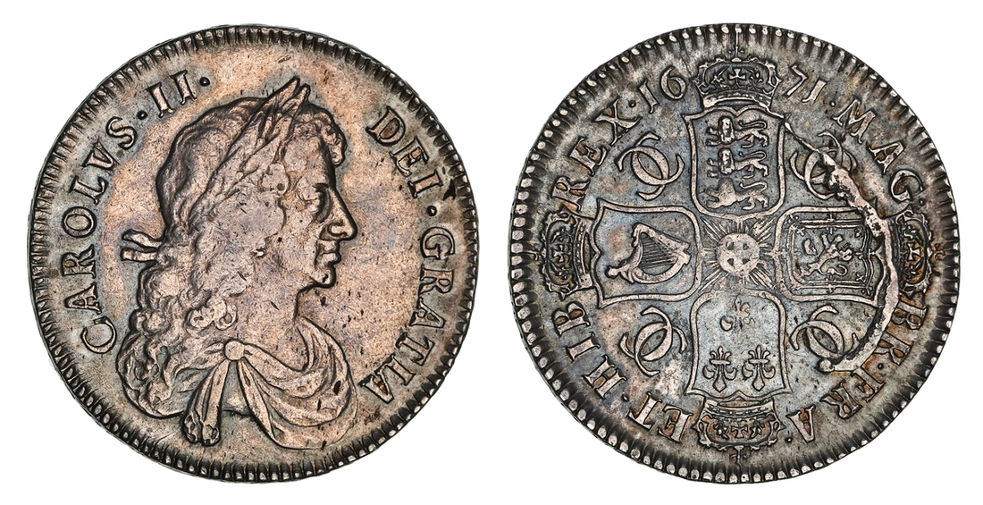 Charles II (1660-1685), Halfcrown, 1671 V. TERTIO, third laureate and draped bust variety right, rev. no not after HIB, crowned cruciform shields, interlinked C's in angles, ten strings to harp, upwards lettered edge, 14.98g, 6h (ESC 468; Bull 457; S.3366), flan flaw through reverse, lightly contact marked and softness to hair, otherwise with a pleasing blue-silver tone and a residual lustre, very fine