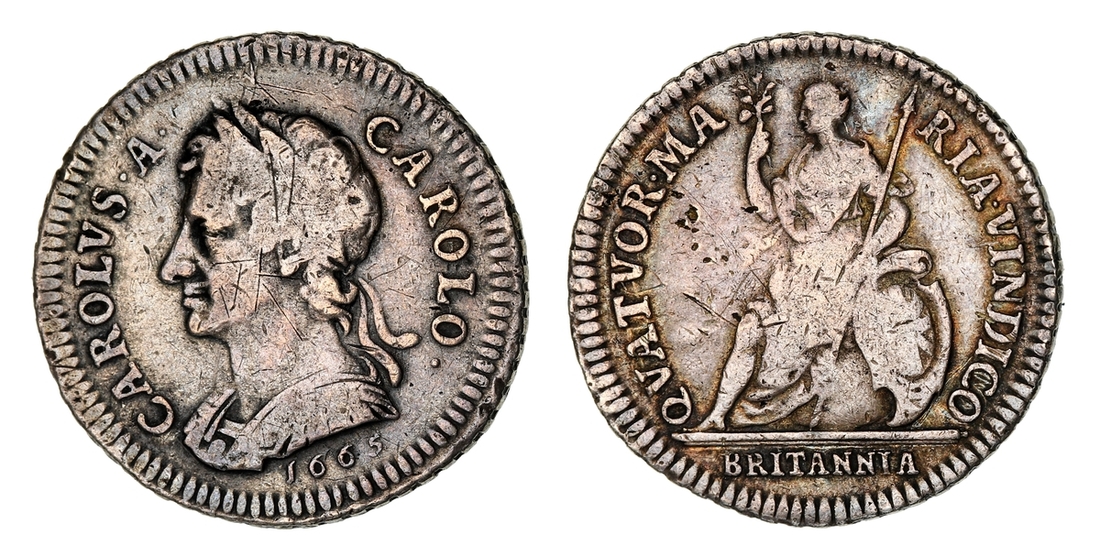 Charles II (1660-1685), Silver Pattern Farthing, 1665, by John Roettier, CAROLVS . A . CAROLO ., laureate and armoured bust left, with short hair, rev. QVATVOR . MARIA VINDICO, Britannia seated left, with loose drapery, holding spear and branch, BRITANNIA in exergue below, edge milled, 6.81g, 12h (BMC [Peck] 407), bagmarked and smoothed to devices, more prominent hairlines scratches to face, with toning to peripheries, bold fine