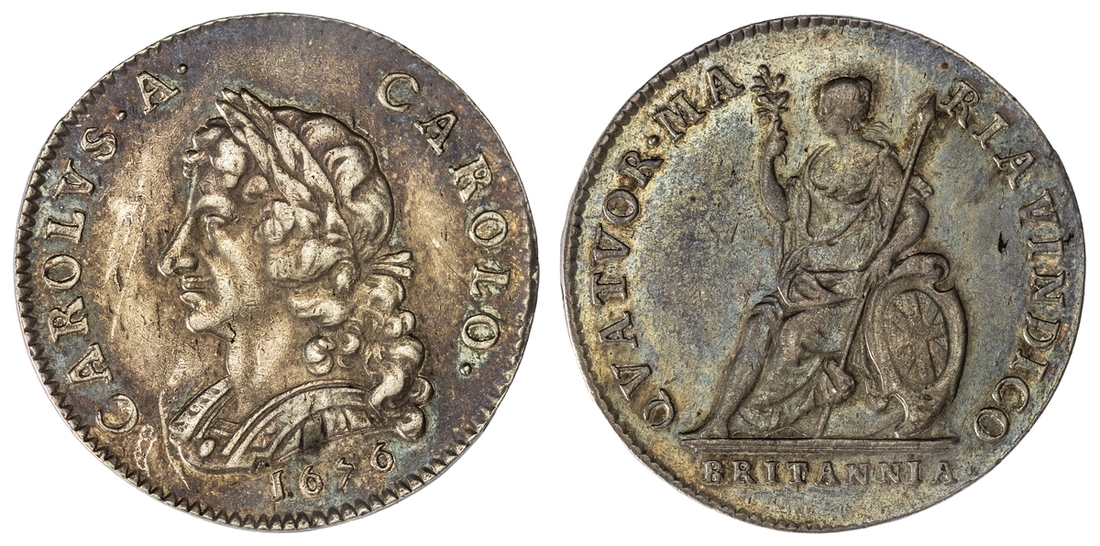 Charles II (1660-1685), Silver Pattern Farthing, 1676, CAROLVS . A . CAROLO ., laureate and armoured bust left, with long hair, rev. QVATVOR . MARIA VINDICO, Britannia seated left, with loose drapery, holding spear and branch, BRITANNIA in exergue below, edge plain, 6.15g, 12h (BMC [Peck] 492), touch of softness to highest points, faint hairline through LO in obverse legend, richly and pleasingly toned to flashy and near brilliant fields, good very fine