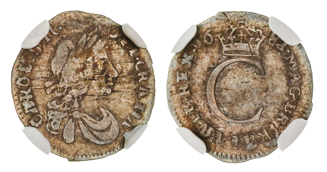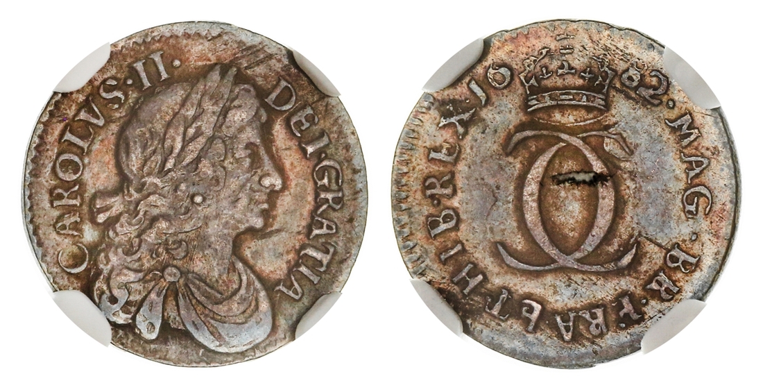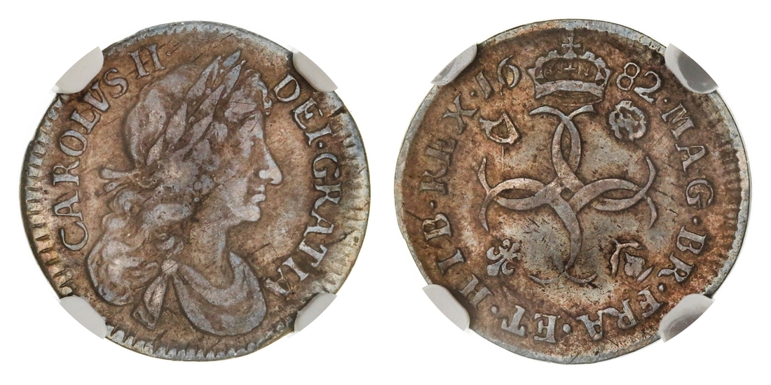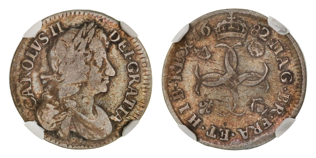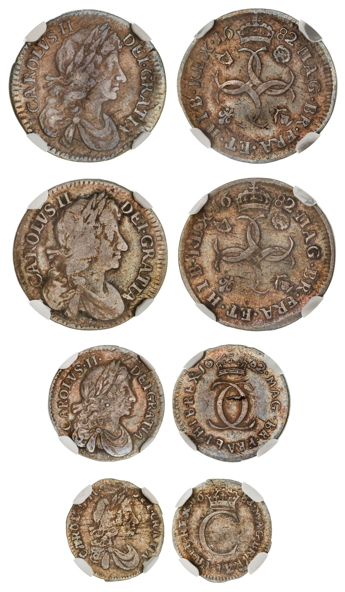 NGC AU55-VF | Charles II (1660-1685), Maundy Set, 1682, Penny, 1682/1, laureate, draped and cuirassed bust right, rev. crowned value, edges plain (ESC 2378; [Penny, ESC 2290]; Bull 605; S.3392) Fourpence, Threepence and Penny soft to portraits, the Fourpence with some staining, bolder fine to very fine, the Twopence toned and with lustre, extremely fine, in NGC holders, graded XF40 [Fourpence] (Cert. #8464067-044) / VF DETAILS ~ Environmental Damage [Threepence] (Cert. #8464067-043) / AU55 [Twopence] *Top Pop* (Cert. #8464067-042) / VF25 [Penny] *Top Pop* (Cert. #8464067-041) (4)