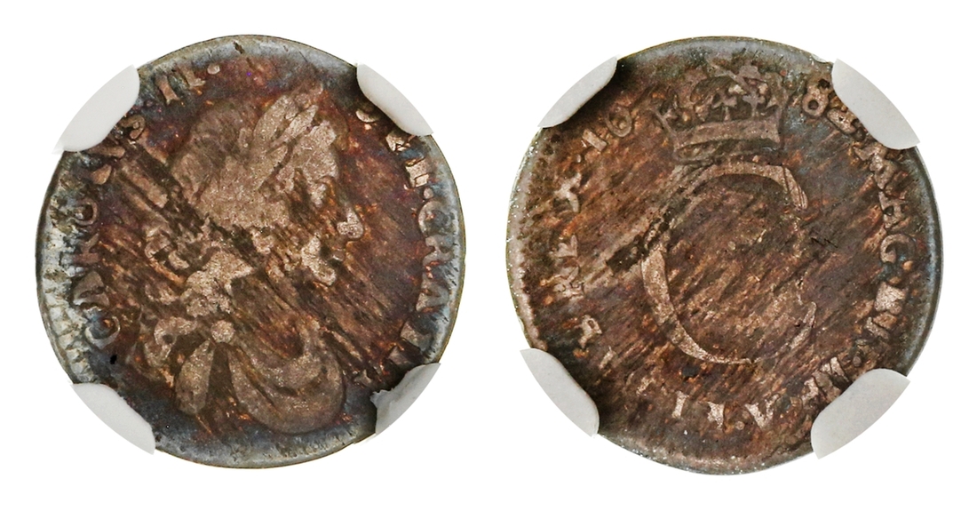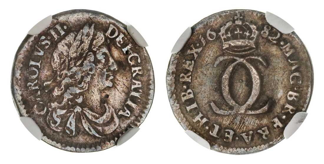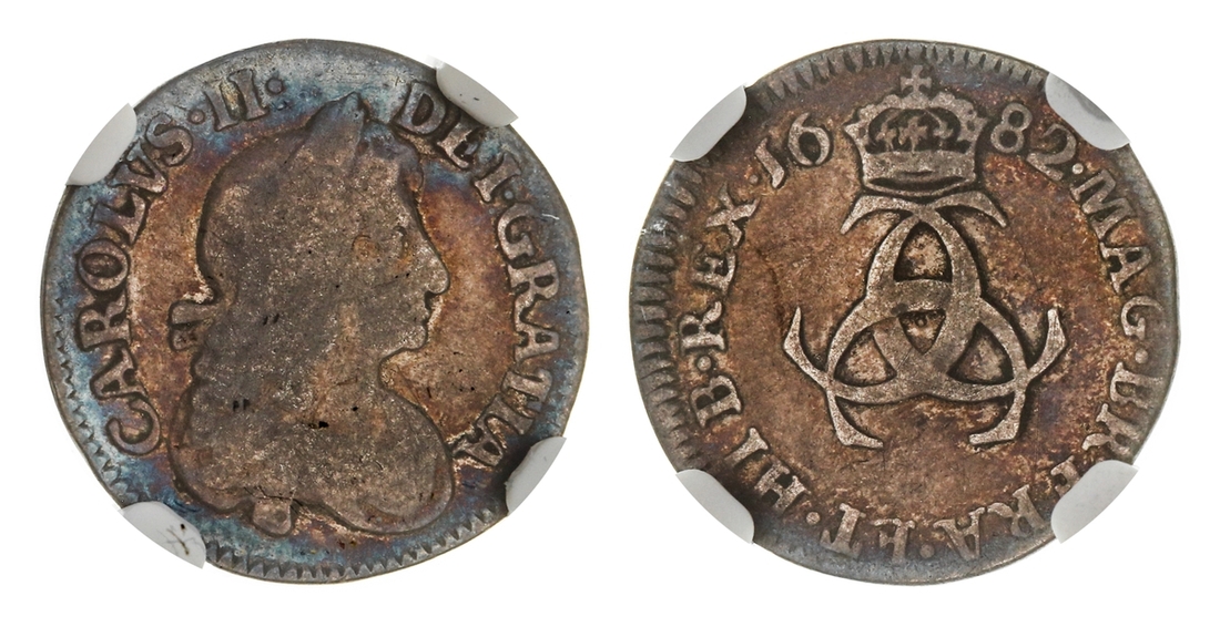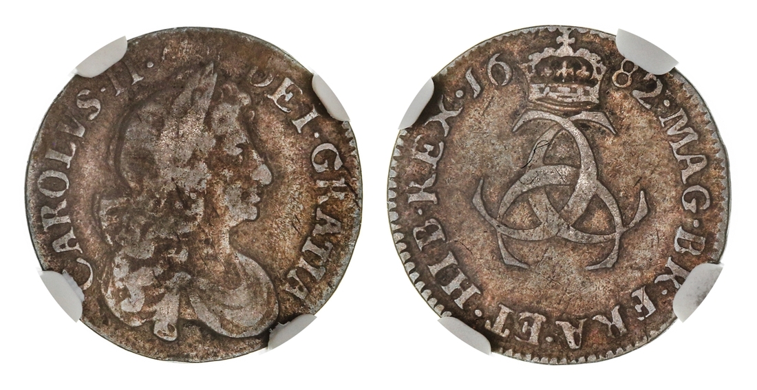 NGC XF-F15 | Charles II (1660-1685) Incomplete Maundy Set, 1682, laureate, draped and cuirassed bust right, rev. crowned value, edges plain, including, VF25 | Threepence, 1682 (ESC 1855; Bull 636; S.3384), fine, in NGC holder, graded VF25 (Cert. #8464067-010); G6 | Threepence, 1682 (ESC 1855; Bull 636; S.3384), toned, fair, in NGC holder, graded G6 (Cert. #8464067-055); XF DETAILS | Twopence, 1682 (ESC 2185; Bull 698; S.3388), fair, in NGC holder, graded XF DETAILS ~ Damaged (Cert. #8464067-054); NGC F15 | Penny, 1682/1 (ESC 2290; Bull 720; S.3390), toned, fine, in NGC holder, graded F15 (Cert. #8464067-053) (4)